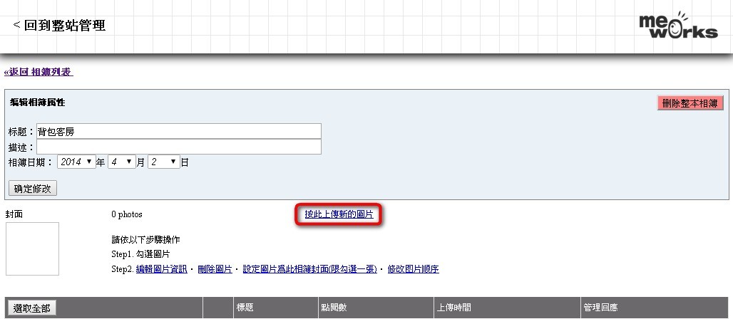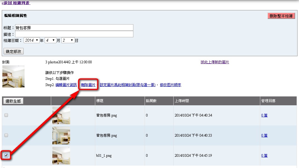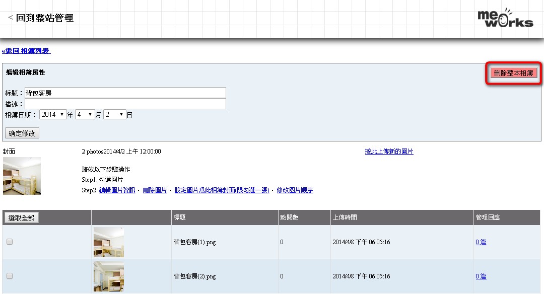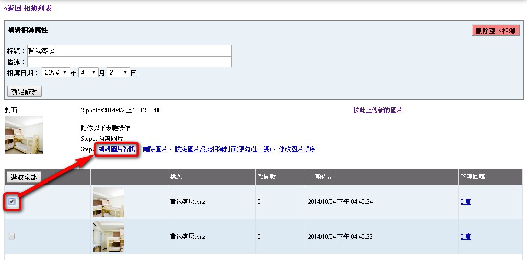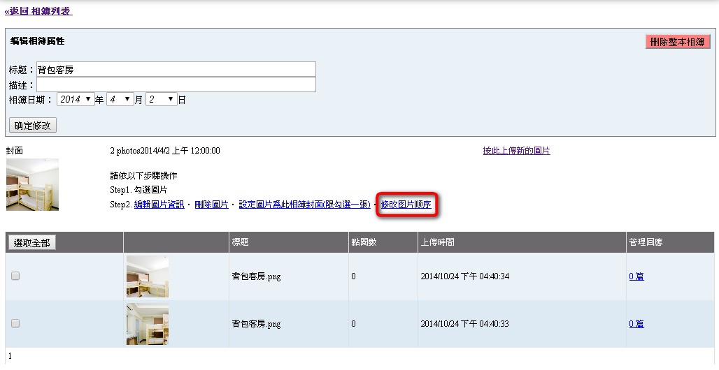 (三) 編輯相簿:選擇相簿後,可進入編輯圖片資訊、設定相簿封面、修改圖片順序、刪除圖片