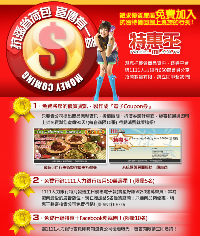1111除了徵才,還能幫您增財!詳情請洽服務人員...