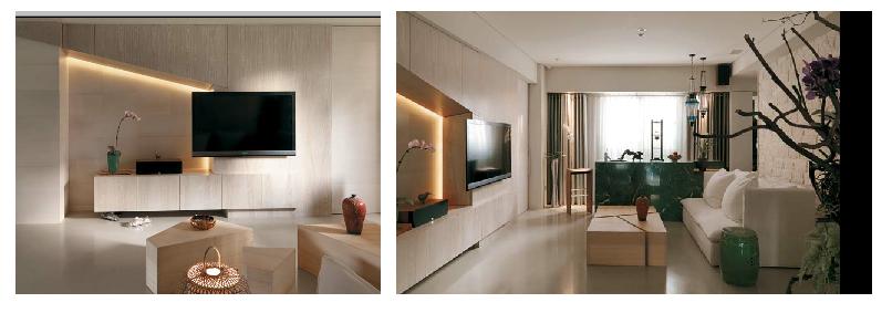 此案作為新成屋而言,設計師聆聽業主一人居住的需求,因此將格局全數重整為適合單身居住的自在空間,沒有過多的格局阻礙都市生活當中已然狹隘的生存空間,就是營造寬敞而自在的生活態度與通風採光良好的環境。由於業主訴求簡單、自在的生活,與純淨的韻味,並且有泡茶的習慣,於是設計師導入一個與自然融合的生活風格,並規劃一間茶室,在細節上的鋪陳中,運用材質塑造出最純然的室內空間。進入空間,40坪的空間中,吳承憲設計在入口玄關處運用天然石材作為區隔客廳與玄關的界定與沙發的背牆。天然材質的粗獷質感,也帶給室內空間自然的氛圍。而電視主牆由於上方畸零的樑柱,設計師以天然木皮與造型櫃化解原樑柱問題,並以設計的手法美化空間。而由於一人居住的空間,因此廚房與餐廳的需求也就並非重點,設計師規劃開放式中島設計,讓業主得以視需求作多功能的使用,黑色石材的運用,讓自然純淨的原色空間,多了一股沉穩的氣質與層次感。