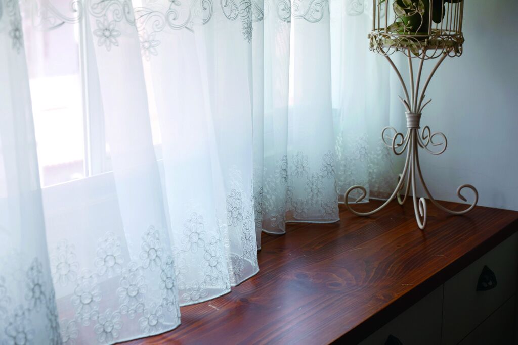 窗簾的巧妙運用,更為空間添增不少風采。像是運用在餐廳空間的雙層式窗簾搭配,是以素雅圖騰花布簾和花朵繡花窗紗搭配,利用聚酯纖維的材質特性,能夠讓布料的變化較多,亮度也較夠,更不易變黃與脆化。並考量到餐廳空間的採光不夠的因素,運用繡花搭配印花的窗簾,而在顏色上選用淺色系的布料顏色,一布一紗的搭配組合,讓屋主在用餐的時刻,透過暖暖的陽光照耀,由窗紗轉折進入室內,帶來充滿元氣的活力氛圍。同時這款繡花窗紗是利用上邊式做拉摺的效果,而下襬則是加車鉛條,讓布料在陽光透射的時候,也不會有摺邊不同色的情形產生。透過窗簾的柔美語彙,讓空間除了溫暖之外,更有甜美的幸福感受。