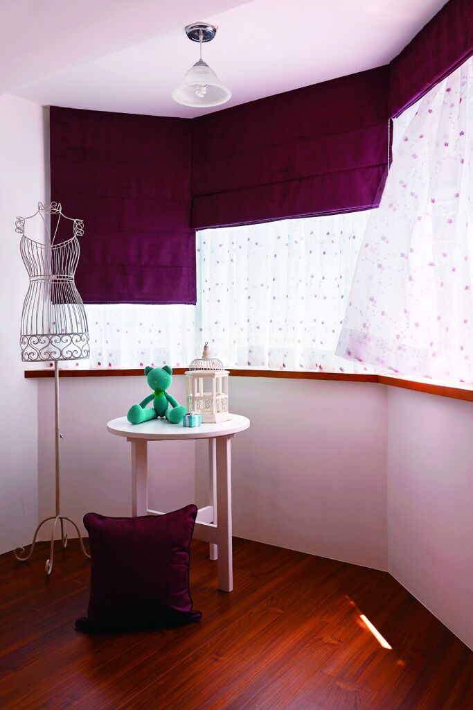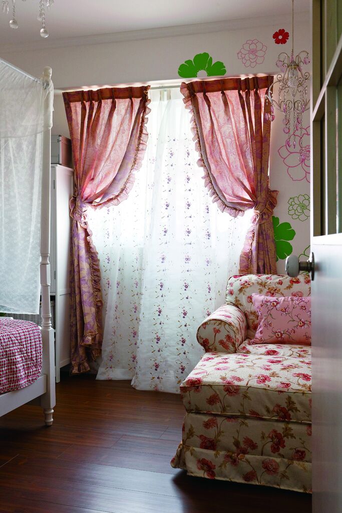 美麗的窗簾除了在餐廳中展現之外,更於臥室之中展現其優美的姿態,搭配著空間中的鄉村風格,此處則以具有花卉圖騰的布樣呈現,以扶桑花的紡絲材質搭配不同於餐廳的花朵繡花窗紗,利用窗布本身的特殊織法與材質,增加花版的亮度並使布面略帶光澤感,在荷葉邊設計的映襯下,柔和整體空間。再經由類似ISSEY MIYAKE抓皺處理的繡花窗紗,陽光透過簾布的調節之後,像是營造趣味的嬉戲空間一般,充滿趣味。同樣的花卉窗簾,也同時運用在客房和閱讀區域,無論是客房中的玫瑰印花布或是閱讀區的麂皮素面,都能夠令空間洋溢一股清新的雅緻氛圍,此外,閱讀區與客房的羅馬簾設置,不同一般的橫向拉法,則是更有讓空間放大的效果。透過窗簾,空間裡環繞著柔美的溫馨韻味,典雅的鄉村風設計,讓人彷彿身處在戶外庭院一般,愜意舒適。