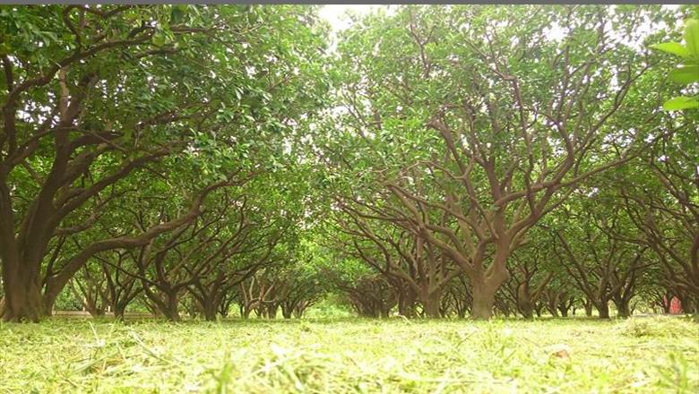 占地一公頃的文旦園,枝繁葉茂宛如一座柚樹森林,森林底層枝葉交錯又如一條長達50米的柚子隧道