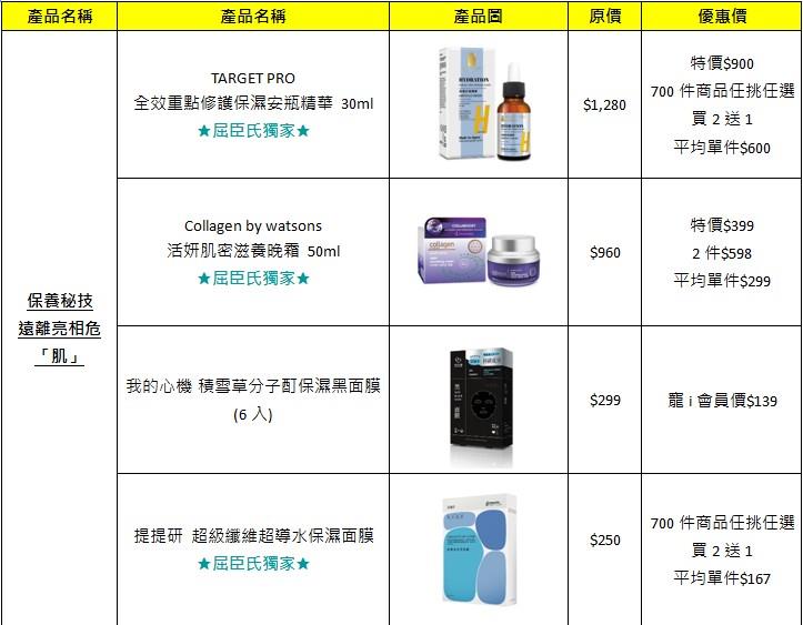 推薦商品:《TARGET PRO 全效重點修護保濕安瓶精華 30ml》、《Collagen by watsons 活妍肌密滋養晚霜 50ml》、《我的心機 積雪草分子酊保濕黑面膜》、《提提研 超級纖維超導水保濕面膜》