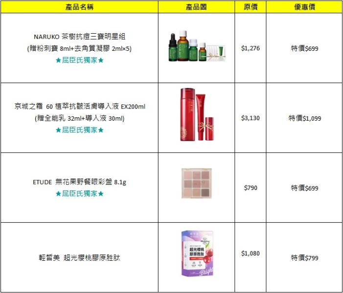 推薦商品:《NARUKO茶樹抗痘三寶明星組(贈粉刺寶8ml+去角質凝膠2ml×5)》、《京城之霜 60植萃抗皺活膚導入液EX200ml (贈全能乳32ml+導入液30ml)》、《ETUDE 無花果野餐眼彩盤》、《輕皙美 超光櫻桃膠原胜肽》、《Chirstophe Robin 海鹽舒緩頭皮潔淨霜250ml》