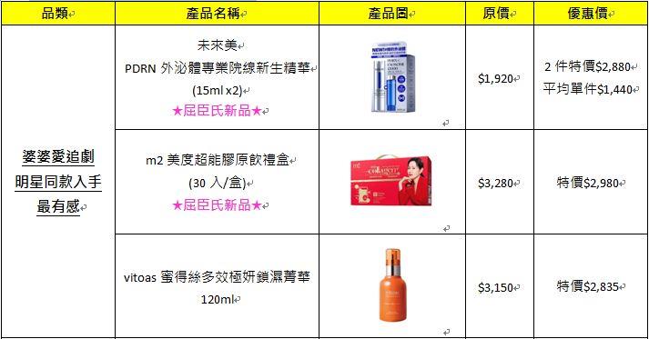 推薦商品:《未來美PDRN外泌體專業院線新生精華》、《m2美度超能膠原飲禮盒》、《vitoas蜜得絲多效極妍鎖濕菁華》