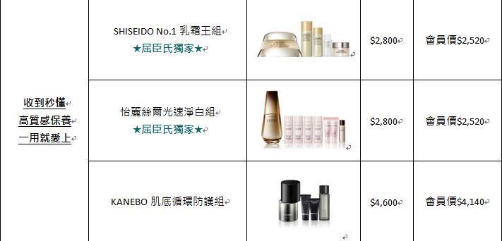 No.1乳霜王組》、《怡麗絲爾光速淨白組》、《KANEBO肌底循環防護組》