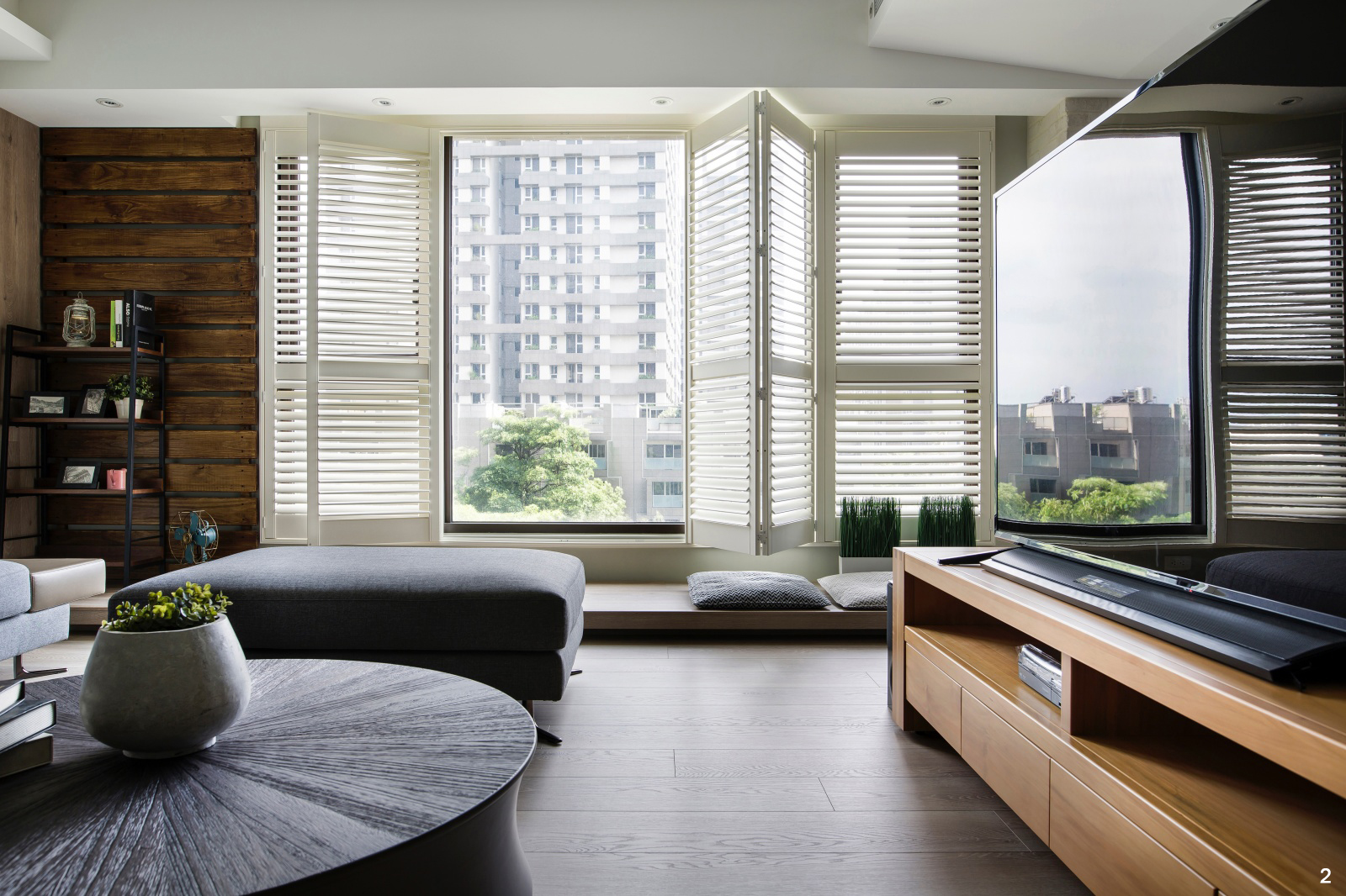 本案引以為傲的,就是陽光光線灑落在空間裡的表現,木百葉擁有自然的肌理能塑造多層次的光影變化,讓窗戶也成為獨一無二的視覺藝術,平日想要看到戶外風景時,將門扇推至一側將陽台外的行道樹映入室內,彷彿相框將窗景框住一般,形成一幅生動的風景畫,窗邊還備有活用建築角度設計的舒適臥榻,一邊喝茶與綠意零距離,使家多了一份舒服自然的氛圍。