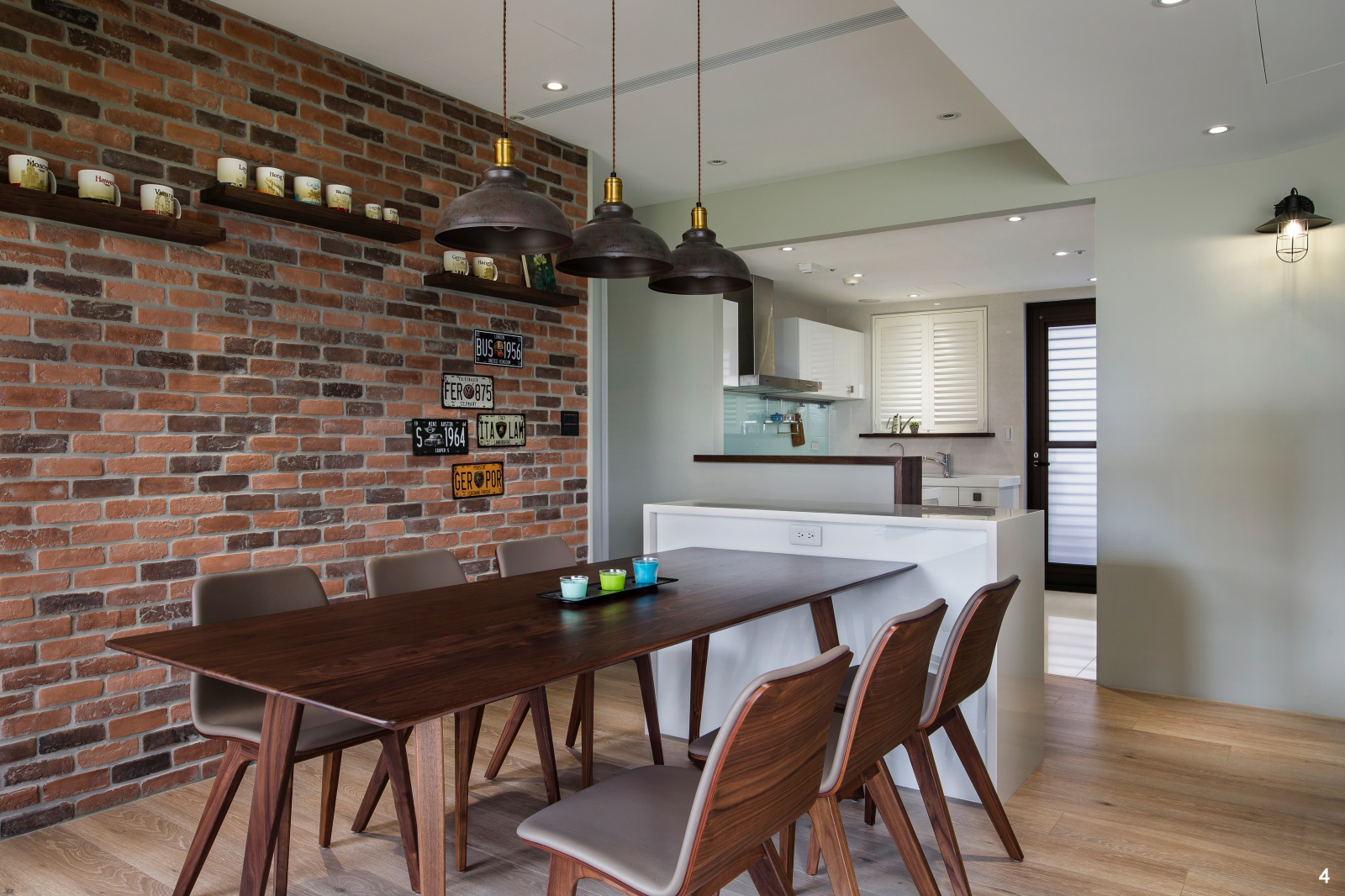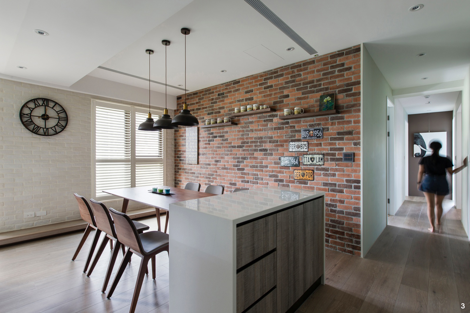 為了不使室內氛圍簡約不沈悶,用餐區挹注紅色文化石磚牆,使其在中性色調間脫穎而出,迎來溫暖平靜感受,搭配美式鐵牌與天頂降下的古典造型吊燈,復古悠閒的生活漸然成形。電視矮牆另一面更成為優雅的收納端景,可放碗盤、酒杯或其他餐桌小物,檯面搭配幾盆植栽、擺飾當作展示平台,櫥櫃更打破以往常規展演不對稱的線性美學拉升視覺延伸感,時尚又個性。開放式廚房具備高度彈性,中島使動線顯得多面向且流暢,延展一家人團聚餐敘的生活尺度。