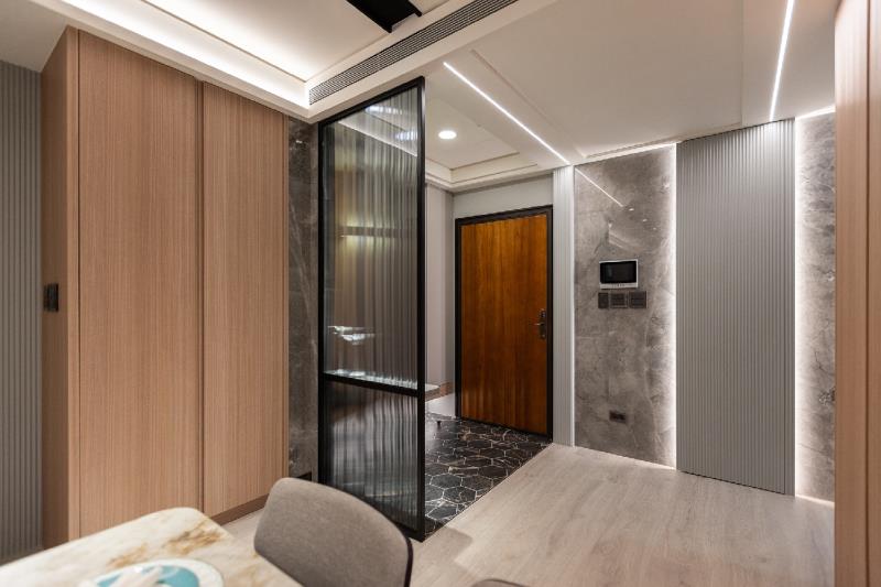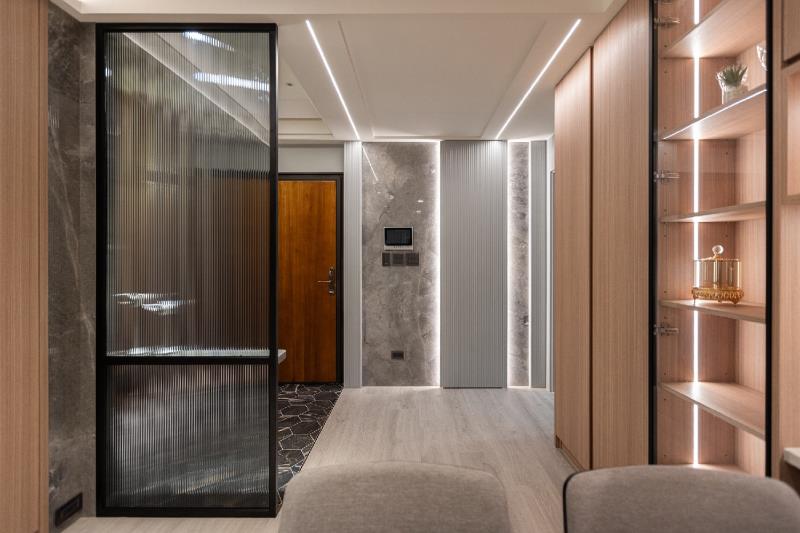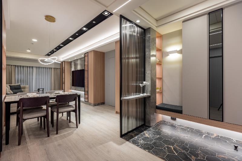 甫入落塵區,地面採用黛黑六角磚,鋪陳出獨特的石材肌理,而無高低落差的地坪設計,可減少居者磕絆受傷的機率。玄關配置一體成型的鞋櫃與穿鞋椅,在節省空間的同時,亦增添居者出入時的便利性。此外,長虹玻璃屏風的設置,不只能緩衝屋內視野,也保持了玄關處的明亮。