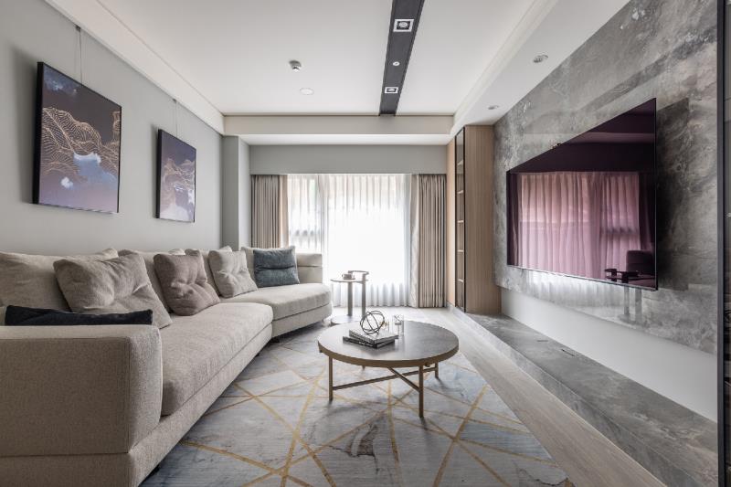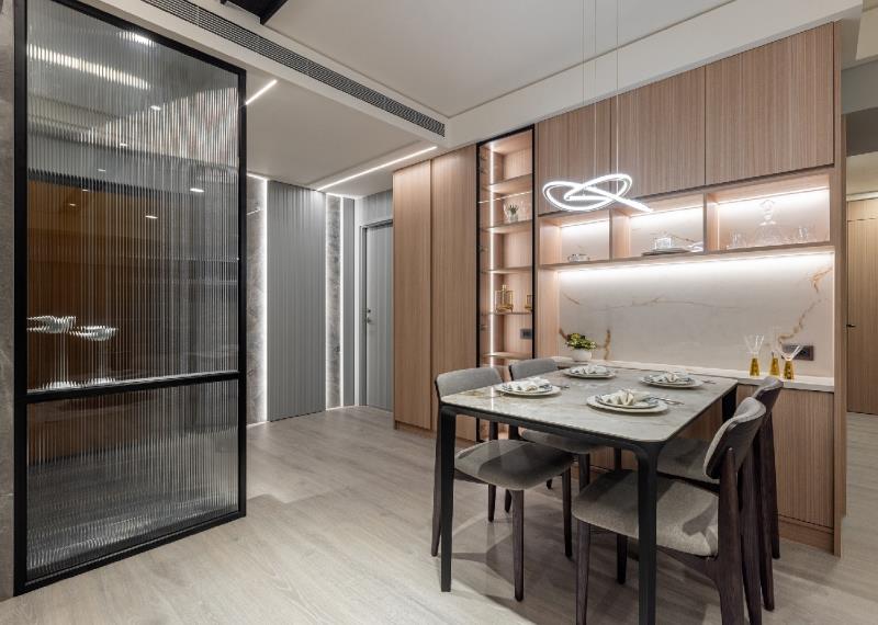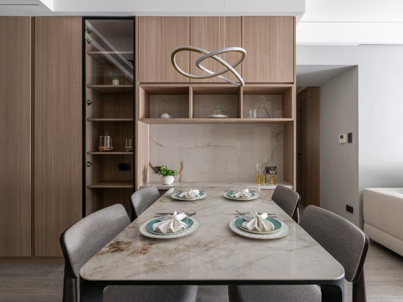 客廳與餐廳使用開放式手法串連,造就流暢動線與開闊的空間感。電視牆兩側規劃對稱的展示櫃,以簡練、俐落的設計挹注實用的儲物機能。餐桌與餐檯選用略帶金質的薄石板,其獨特的瑰麗紋理,為用餐環境帶來時尚質感。餐桌旁成排的木作櫃體,可用來放置各種餐具或電器用品,讓居者用餐時便於順手取用。廚房防火門與電箱運用美曲板搭配油性漆噴塗,營造輕盈、別緻的氛圍,達到美化空間的效果。