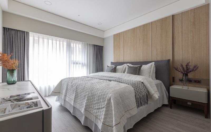 緩步移至私領域,主臥室整體以灰色系與木質調為主軸,塑造溫暖、柔婉的休憩環境,讓居者得以徹底放鬆舒壓。床背牆的實木皮與灰色飾板,採用多重層次的設計手法,堆疊出富有立體感的視覺效果。