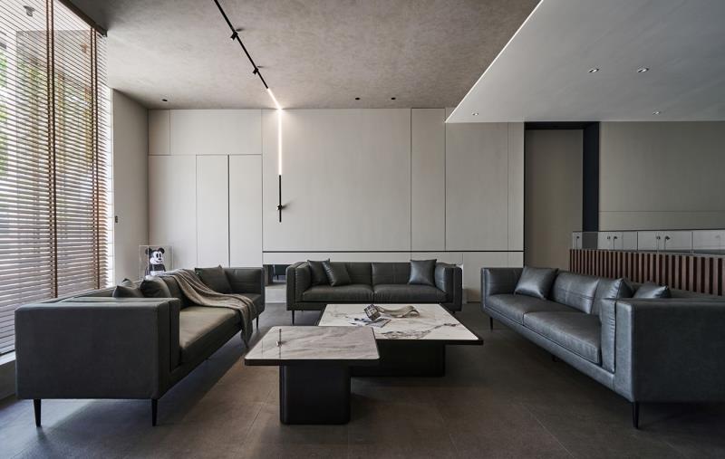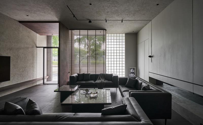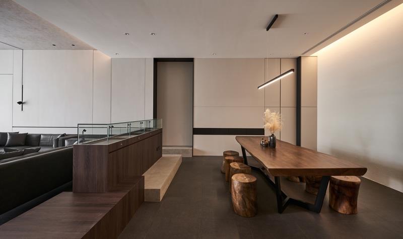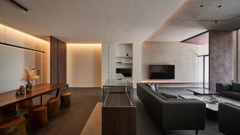 甫入室內,入口處先以深色調底定場域調性,而後再以落地窗的設計將戶外光景援引入室,以此形塑出明暗交織的空間意象。向內走去,為打造出流暢、舒適的互動場所,團隊特意採用開放式規劃將客廳與沏茶區無縫銜接,不僅能維持寬敞的空間尺度,還能促進人與人之間的情感交流。