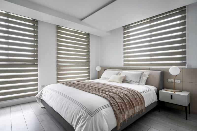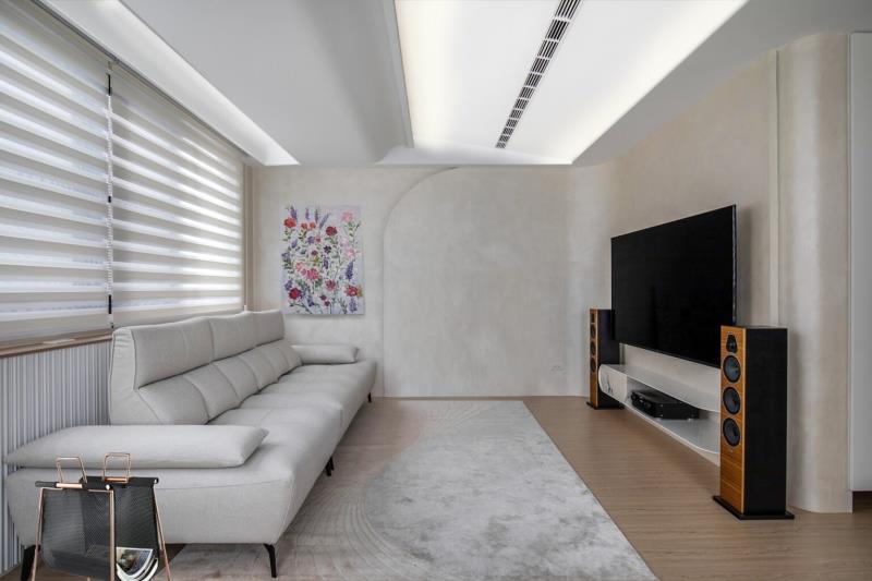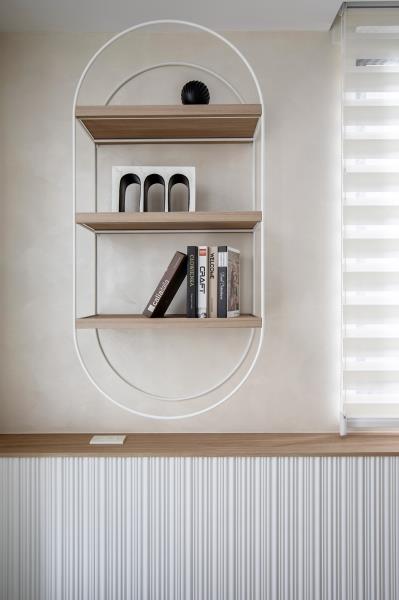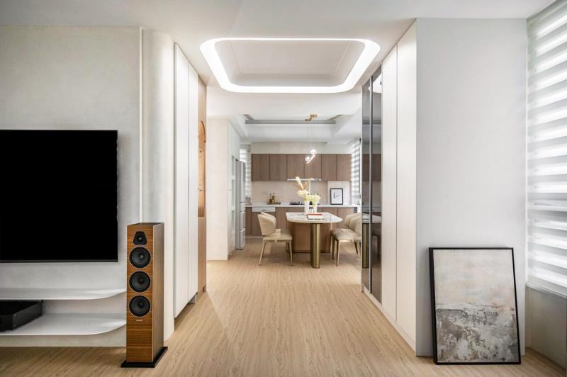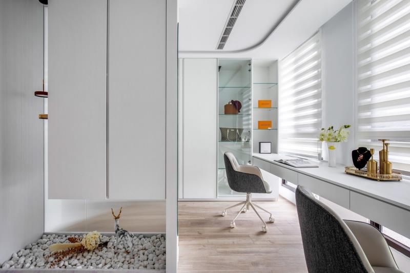 通往至多功能室,設計師特地導入更衣間與辦公區等機能,以此滿足屋主對家的期待。同時,再於入口處增設白石端景,既能為場域注入一抹逸趣,又能為其增加隱密性。緩步移動至臥室,為強調純粹的生活本質,設計師特意以減法的設計思維作為主軸。透過合宜的色彩、線條與材質應用讓空間靜下來,以此為屋主營造出安穩、愜意的休憩氛圍。