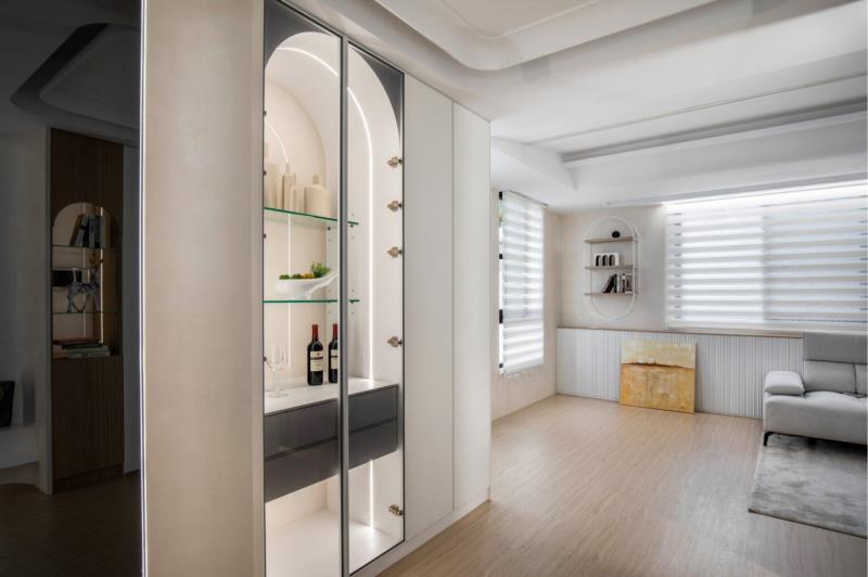 甫入室內,設計師選用大地色系作為空間基底,搭配自然光的映射,一同為住所營造質樸、溫暖的氛圍。另外,為改善原先住宅樑柱過多,而導致格局零碎、畸零空間產生的問題,設計師便決定採取弧形牆面、天花板與玻璃櫃體等配置,以此消弭空間的冷硬與銳利感。其中,轉角的弧形曲面牆設計也能避免屋主碰撞受傷的情形發生。除了考量屋主的訴求之外,設計師亦有重視寵物的需求。從規劃出寬敞的活動空間、各式高度的平台,到選用防水、耐磨的礦石卡扣地板和貓抓布等材料,皆是為了給予寵物一個自在玩耍、友善的生活場域。