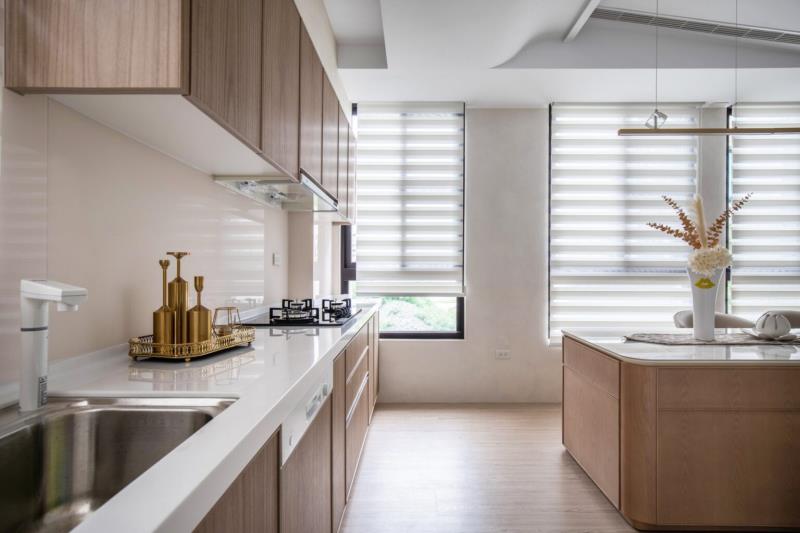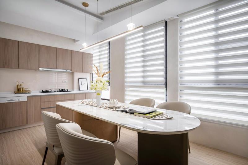 為打造出健康、永續的宜居環境,本案除了採取減法設計之外,亦有採用環保措施與綠建材。首先,配置恰到好處的機能,以避免過度裝飾產生的資源浪費。接著,公、私領域皆設有對外窗,能將大量自然光援引入室,減少人工照明的使用頻率,達到節能減碳的效果。另外,鋪面是選用無毒、零甲醛的礦石卡扣地板,可為屋主與家寵提供安全、友善的居住環境。
