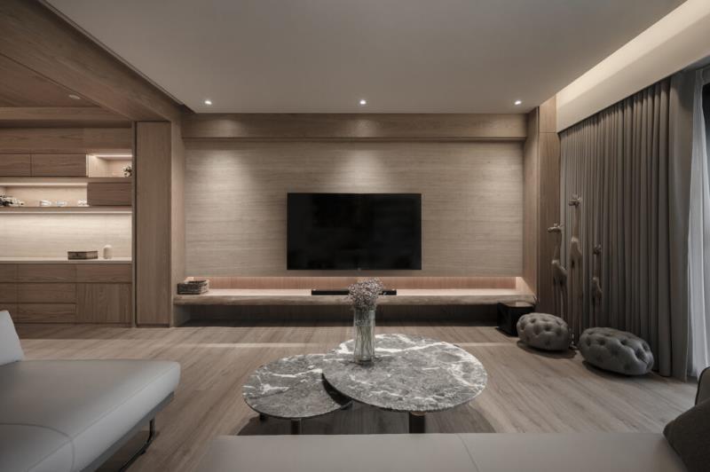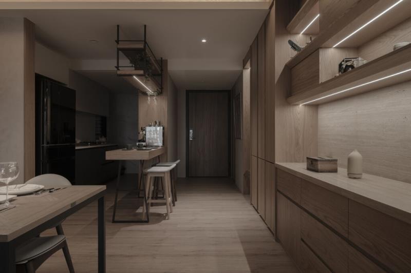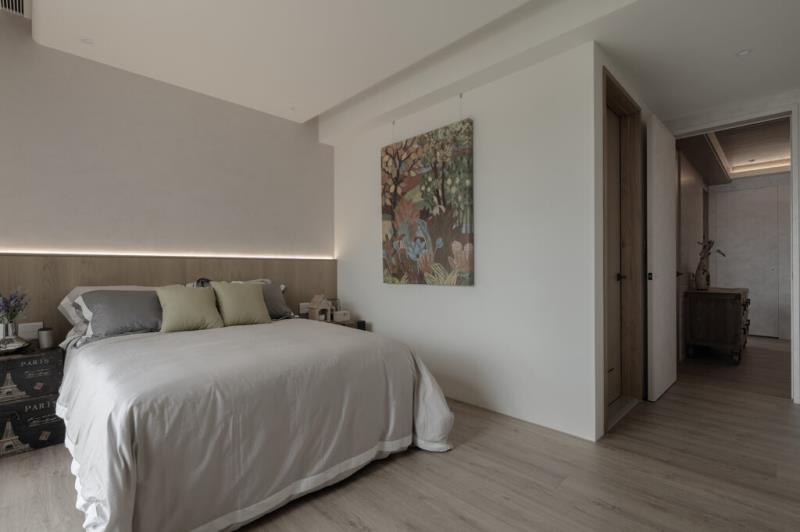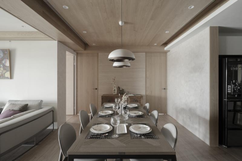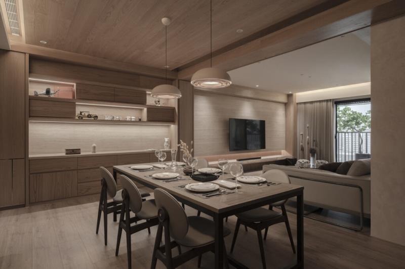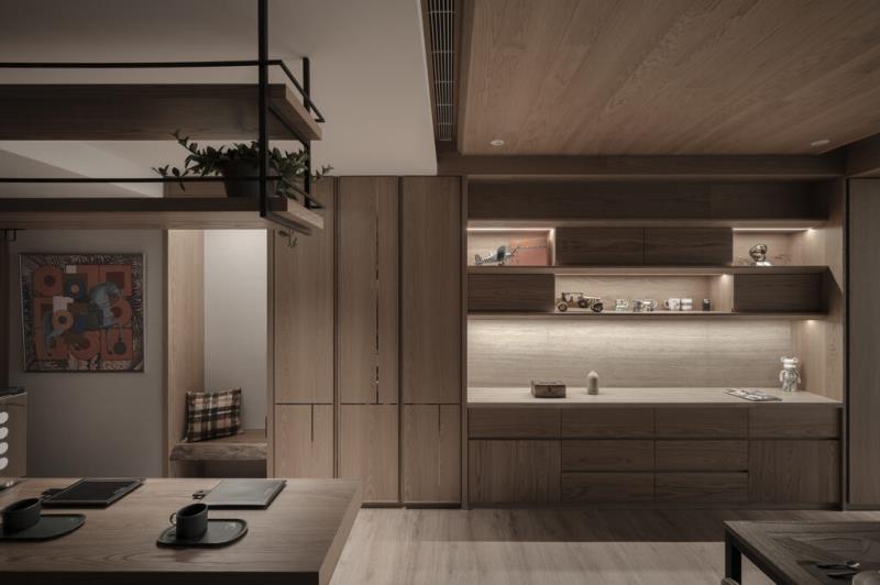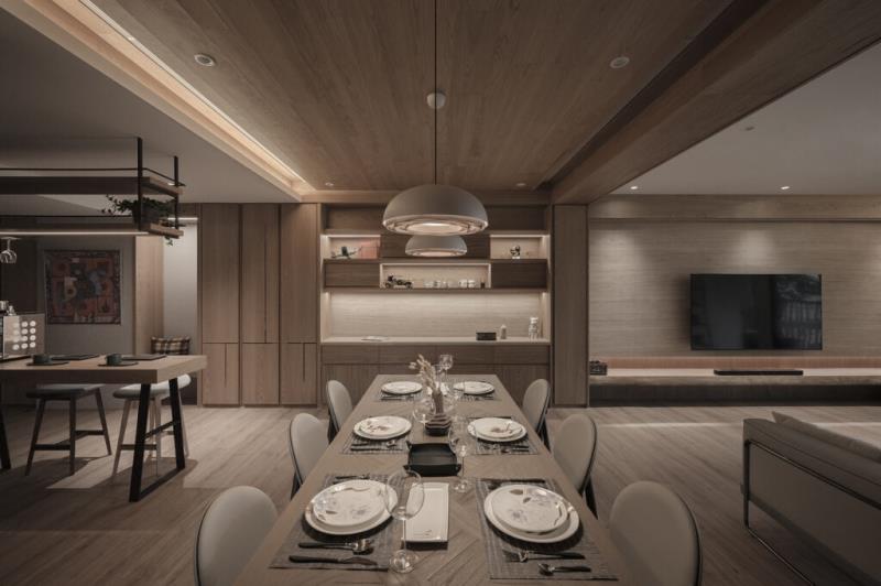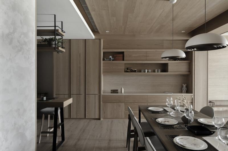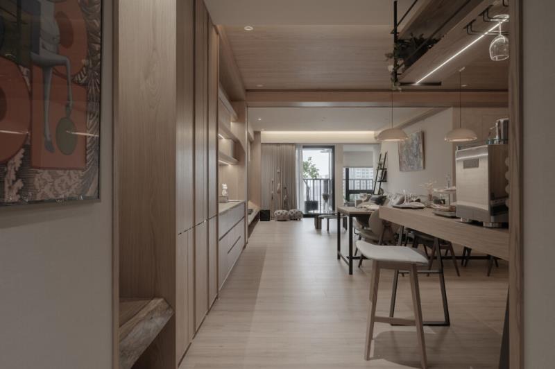 甫入室內,採用開放式串連的客廳、餐廳與廚房,僅以天花板相異的材質區分場域,帶來寬敞的活動空間,可增加家庭成員間的互動性。為了顧及家中不同的年齡層和健康狀況的成員,還加上無障礙設計,確保居者能自在、安全地生活。整體空間以溫潤的木材與純淨的白色鋪陳,搭配植栽綠意,不只呈現在地特有的人文與自然,也挹注一股柔美的暖意。以此讓居者即使身處都市,亦能隨時感受到自然的氣息,擁抱內心的平靜與舒緩。考量到居者對於收納的需求,本案配置多樣化的櫃體,提供靈活且充足的儲物機能。而櫃體大多採用無把手的隱藏式設計,不僅營造整潔、精緻的視覺效果,亦可避免碰撞突出把手受傷的可能性。臥房延續了木紋材質與潔白色調,在柔和的間接光源下,為居者帶來溫馨、放鬆的休憩環境。