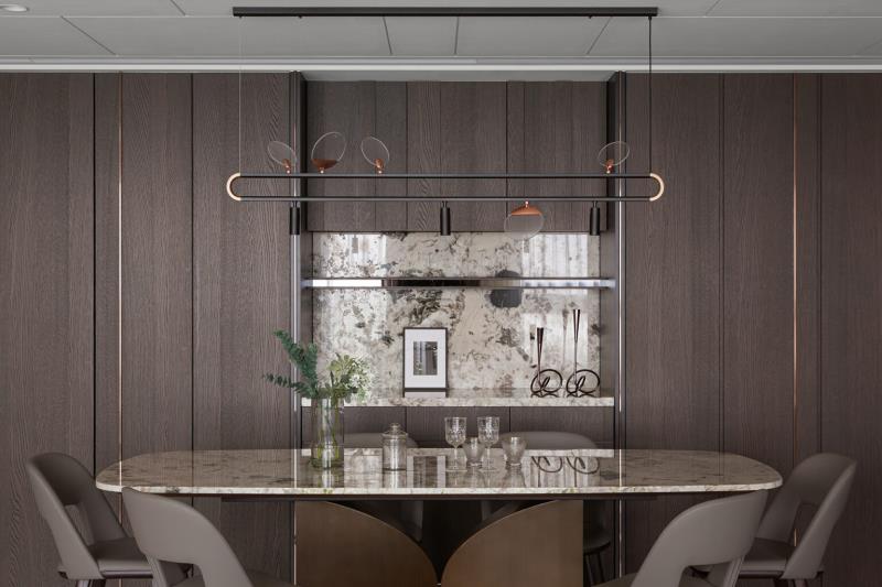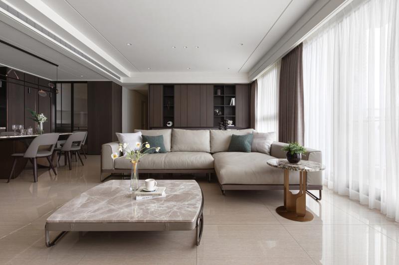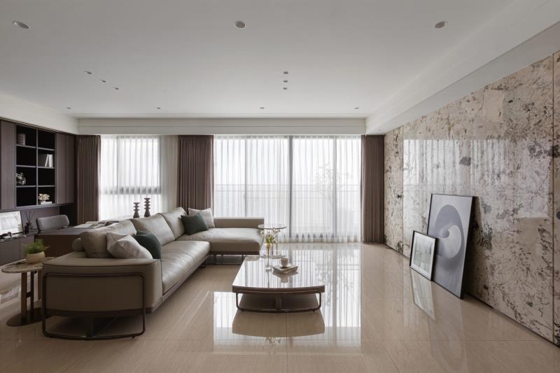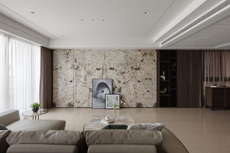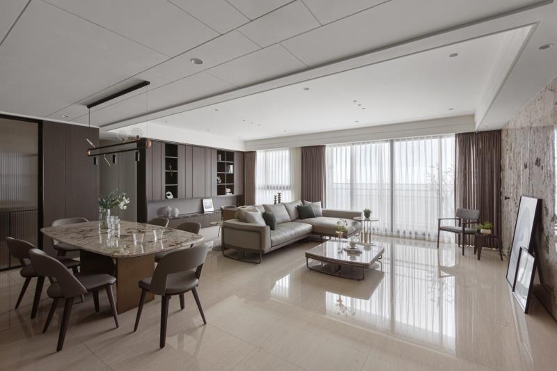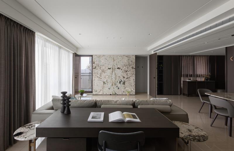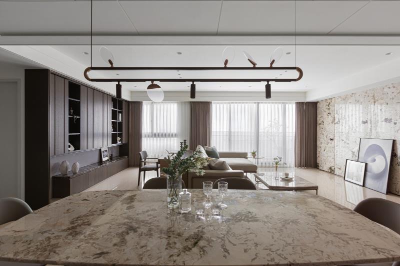 為了提升公領域的開闊感,設計師將原有的四房格局調整為三房,這一改動不僅優化了生活動線,還創造出更為寬敞的活動區域。此外,透過整合式天花板設計,將空調、全熱交換機及各種照明與消防設備巧妙地配置在餐廳區的天花板,避免了瑣碎繁雜的線條,呈現出簡潔、一致的視覺效果。在色調上,設計靈感源自台中自然景觀與都市建築的深淺對比,選用了象徵自然的米色奢石,搭配深色木皮、鍍鈦及鏡面材質,營造出溫馨、和諧且充滿個性的居家氛圍。