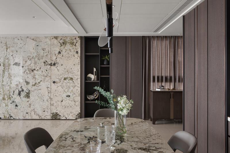 由於原先電視牆的幅寬較窄,設計師巧妙運用了左右對稱的隱藏門設計,將進出儲藏室與景觀陽台的門片隱藏於其中,無形中增加了電視牆的寬度,營造出奢華、大氣的空間氛圍。電視牆採用了頂級奢石材質,並加入V型紋理設計,營造出羽翼般的視覺意象,象徵家庭溫暖與保護的深層寓意。沙發後方的原臥房現已改為書桌區,並設有整面書櫃,不僅提供書籍的收納空間,還成為家中的展示主牆,增添了富有藝術氣息的文化氛圍。用餐區的餐邊櫃與外衣櫃相結合,不僅提升空間使用坪效,也使公領域更加整潔有序,滿足了現代家庭對美觀與實用性的雙重要求。廚房則利用長虹玻璃拉門與用餐區作出區隔,既維持了空間的通透性,又有效阻擋了油煙。