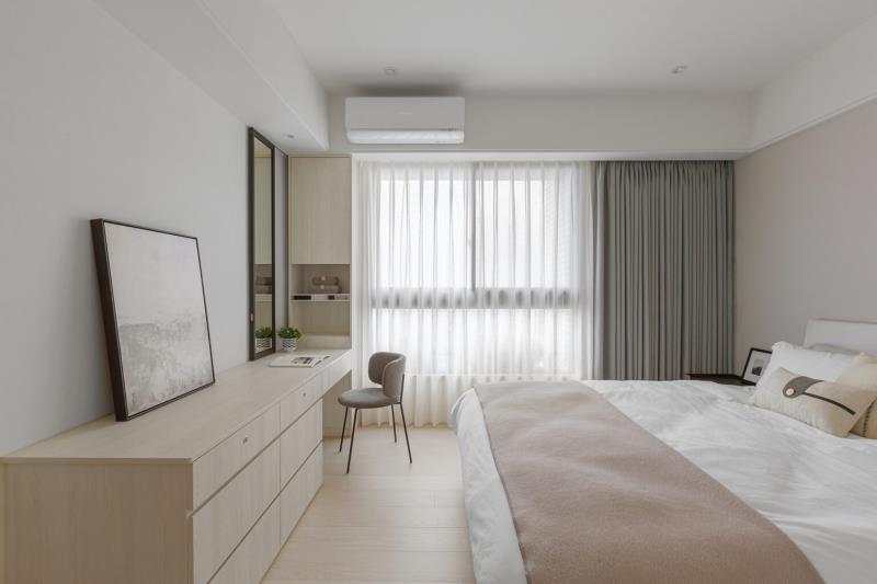 主臥室設計師採用了推拉的鏡面設計,巧妙地解決了東方文化中「床不對鏡子」的風水疑慮,將傳統文化與現代生活需求完美融合。這樣的設計既保留了化妝鏡的功能性,又能隨時將鏡子隱藏起來,為居住者帶來心理上的安心感。