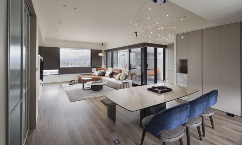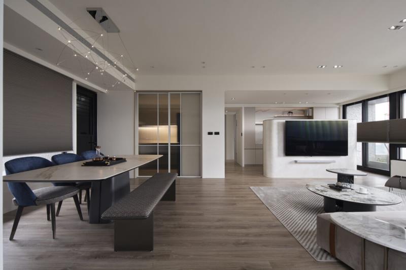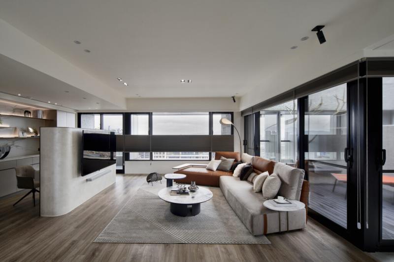 甫入室內,空間藉由多面對外窗增加整體的採光度。而為避免強烈的光照導致內部環境過熱,團隊特地選用隔熱窗簾進行遮光,不僅能保護傢俱免受日曬損害,還能為屋主提供清爽宜人的休憩氛圍。置身於公領域,團隊先是以開放式設計將客廳與餐廳做整合,再搭配大型露台與陽台的設定,讓空間尺度更顯開闊。其中,電視牆是採用弧形矮牆設計,能改善整面式牆體帶來的壓迫感。同時,住所的陳設多以輕盈的鐵件、薄板元素為主,可形塑現代簡約的空間形象和都會感。另外,為防止烹調時油煙逸散之問題,廚房是使用玻璃拉門作為隔間,以維持屋內空氣清新。