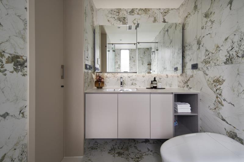 緩步移動至私領域,臥室延續柔和的色彩應用來營造靜謐祥和的睡眠環境。其中,床頭背牆和窗簾巧妙運用垂直與橫向的線性元素,為場域帶來和諧又富含層次的視覺感受。通往至衛浴室,團隊選用純色的系統板搭配紋理多變的鈦鋼石板磚,既提升了質感,又能讓空間比重達到平衡。