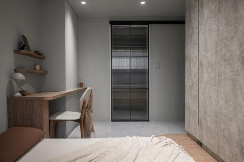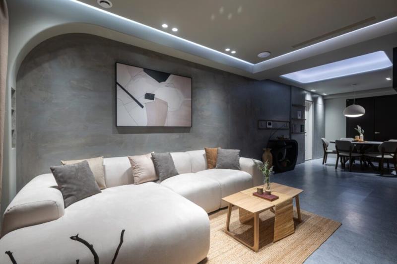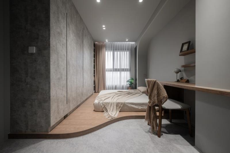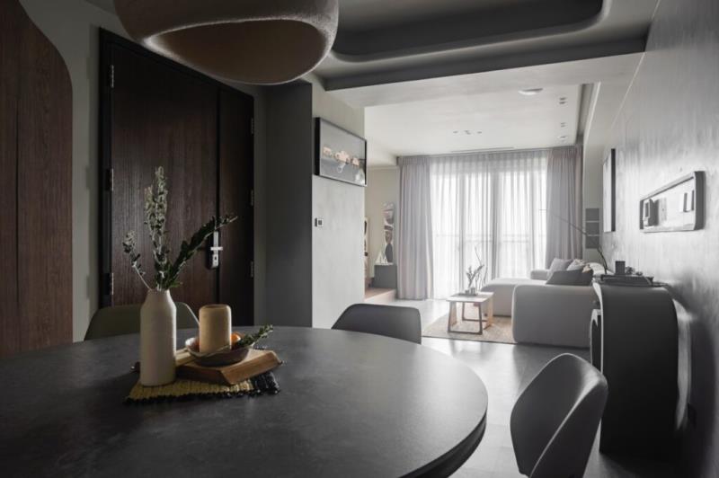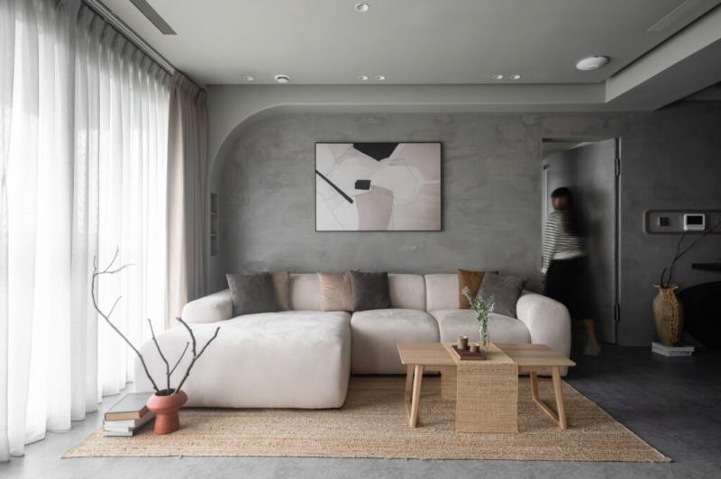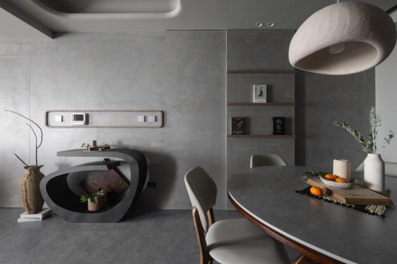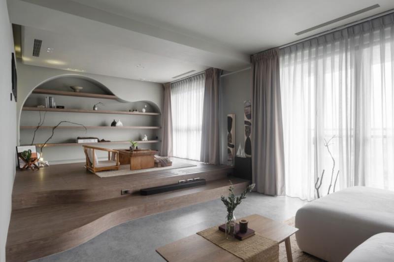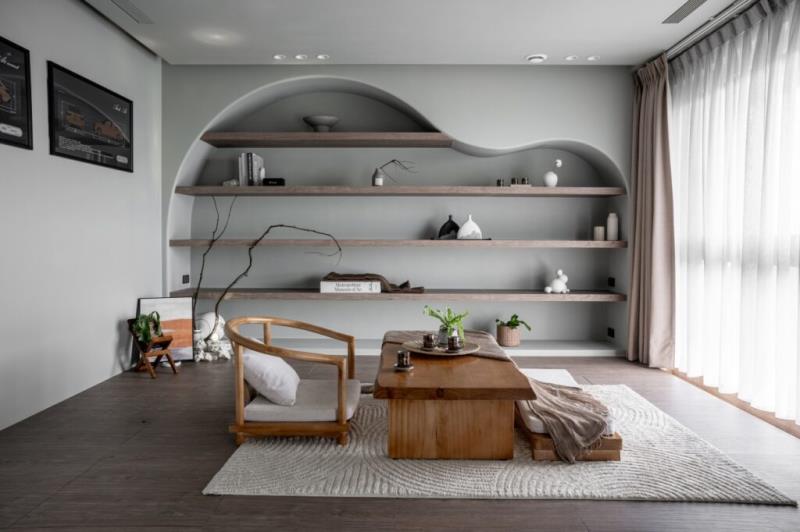 整體以低飽和色彩作為空間基調,再結合藝術漆料、木作的應用,以及弧形曲面的設計,可為空間營造出自然、圓滑、質樸、溫潤又富含層次的意境。其中,牆面鏝抹的藝術漆料所帶有的顆粒感,不僅能為表面增加獨特肌理,還能體現侘寂風的中心思想-「接納生命萬物的不完美」之寓意。值得一提的是,茶室的設計是以東方禪意進行擘劃,透過枯山水的空間意象,能為居者營造出慢活的生活場景。
