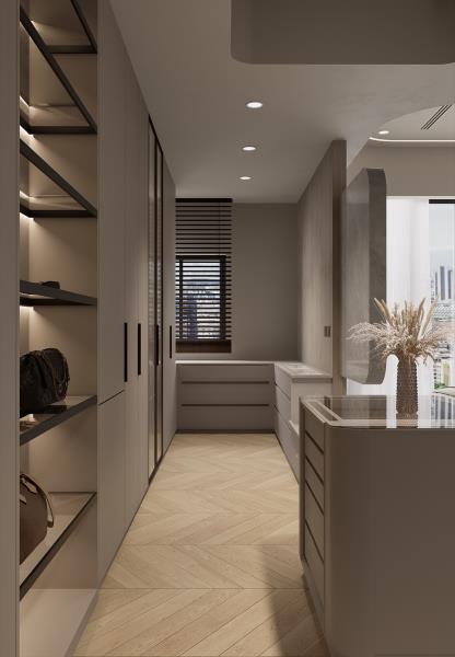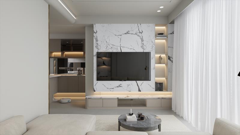 為了創造環保、永續、健康的住宅,設計師於各層面都費盡心思。於建材層面上,選用低甲醛的KD板材和無毒、防霉的環保塗料,不只保護施工人員與居者的健康,亦落實愛護地球的目標。而大板磁磚、鋼化玻璃、天然橡木皮等耐久性高且易於養護的材料,能減少損壞需要汰換或修補的機率,避免多餘的資源浪費。此外,本案配置全戶除濕系統、全戶淨水系統、全屋HEPA過濾全熱交換空氣濾淨,不僅能提升空氣品質、維持室內溫度穩定,還能夠減少能源消耗,達到節能減碳的效果。