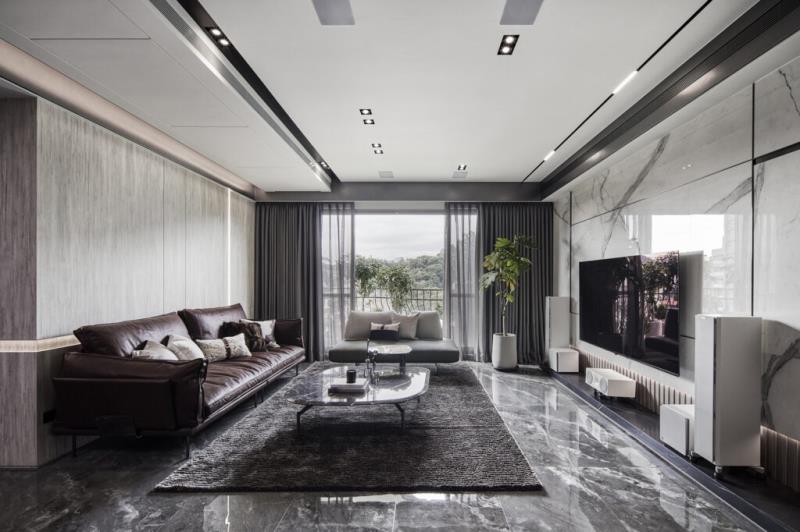 入室之際,團隊將鞋櫃、機具櫃與多功能收納櫃隱匿於木紋壁面之後,並將神龕巧妙融入其中,使空間畫面盡顯乾淨俐落。同時,選用長虹玻璃屏風作為玄關端景,既化解了風水疑慮,又能維持場域的通透度。向內走去,整體基調汲取古書經典的褐色外皮紋理,並將其轉化為木質材料鋪陳於住所之中。同時搭配石材板磚的應用,展現出多變光澤,與窗外自然景致相互輝映,營造出靜謐悠然的生活氛圍。