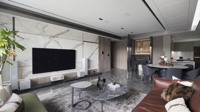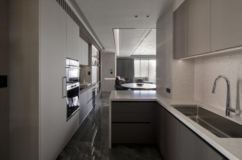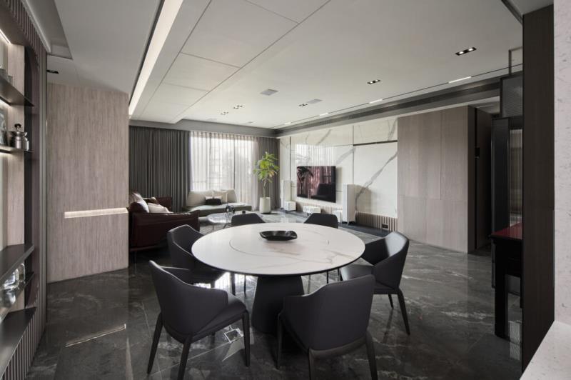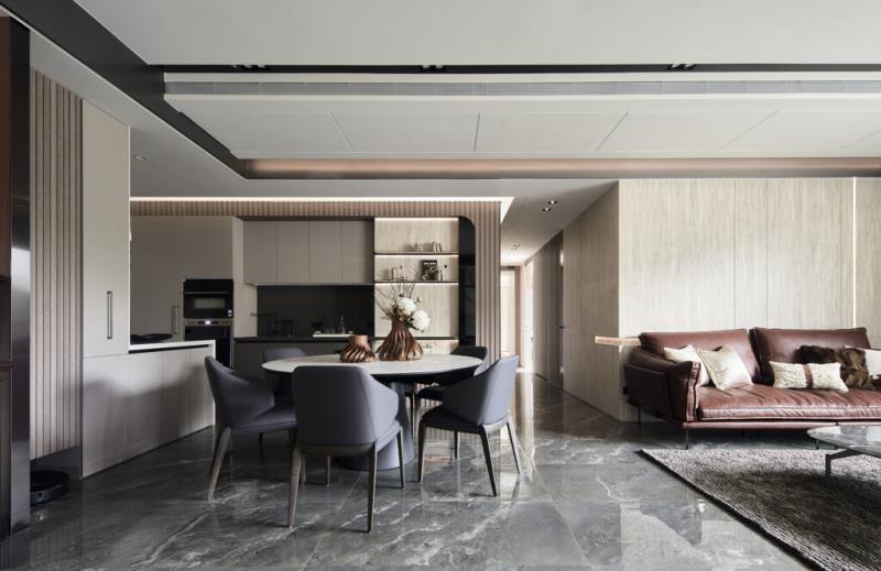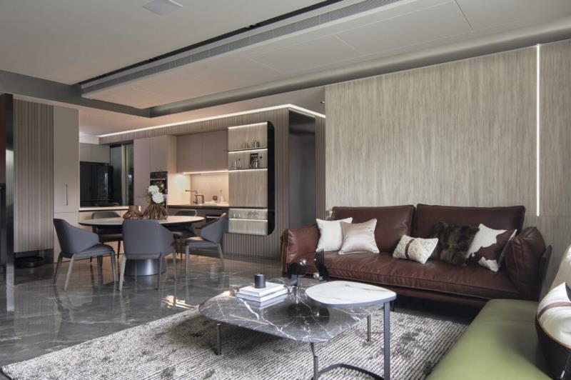 置身於公領域,團隊特意採開放式設計將客廳、餐廳與廚房做整合,強調空間的開闊與連貫性。同時,再將廊道加寬、門扇拉高,強化動線的流暢度與空間的寬敞大氣。而天花板採用線性設計結合磁吸式燈軌,不僅能弱化維修孔的存在感,又能塑造出俐落層次。另外,為提升廚房機能,團隊善用開放的格局配置,裝設了多種廚具設備於餐廳至廚房。