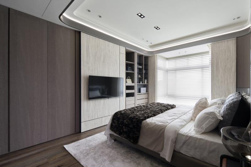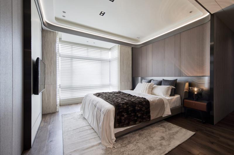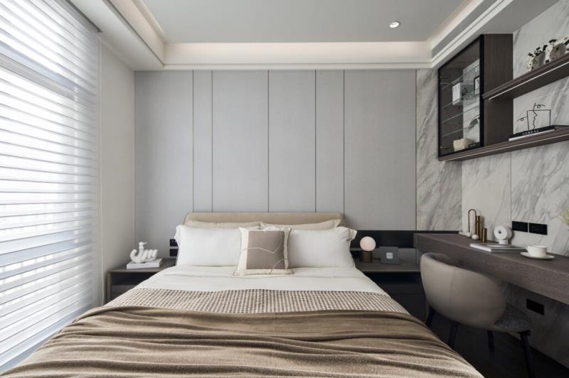 緩步移動至私領域,其專注於營造舒適且私密的生活空間。臥室主要採用天然木板進行鋪陳,自然的材質肌理為場域挹注寧靜沉穩的氣息。窗簾則選用透光性佳的風琴簾,使自然光以柔和的狀態映射入室,為屋主提供療癒放鬆的休憩體驗。