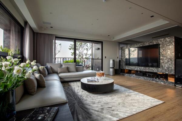 此案整體運用經典的黑、白、灰色系營造優雅大氣的格調,鮮豔度較低的色彩也柔和了視覺上的感受,讓人能夠愜意、放鬆的休憩。客廳內的電視牆採用了半高牆設計,不同於一般住宅整面式的隔牆,不僅能提升採光和通風效果,還能讓原本寬闊的空間多了一種串聯的意象,拉近居者之間的生活距離,產生安心、融洽的感受。與客廳間以電視牆為界的餐廳,由環環相扣造型的吊燈提供柔和光源,搭配輕奢風的桌椅,展現出精緻的藝術氣息。電視牆的背面設計成展示收納櫃,充分的利用空間提供儲物機能。客廳與開放式廚房之間只相隔一座中島吧台,使整體視覺上更顯開闊,也讓居住者能在烹飪時與客廳的親朋好友互動,達到維繫感情的功能。