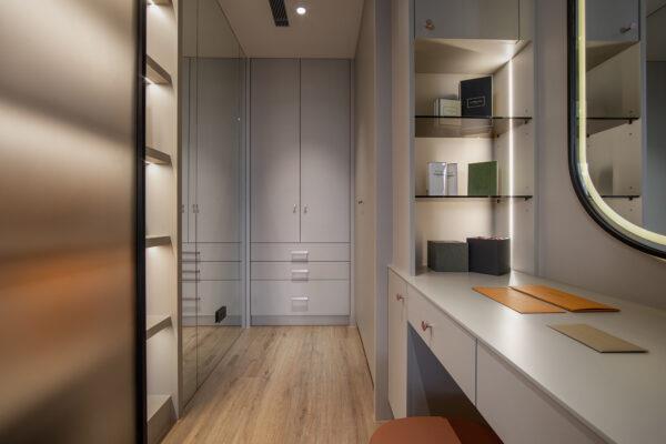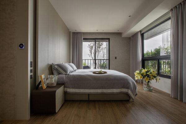 主臥室延續公領域的灰階色調,在昏黃的間接照明之下,使空間充滿生活的詩意和情感。此外設計師還特意帶入綠化設計,在陽台上配置了景觀植栽,使綠意和光影能夠從落地窗外流入室內,打造出與自然環境和諧相襯的居住體驗。小孩房則以原木色與淺色調為主軸,使其具有溫暖安逸的溫馨感受。收納架的邊緣使用弧形設計而非一般的直角造型,讓孩子能夠安心玩耍,不必害怕磕絆受傷,塑造出一個舒適、健康的成長環境。