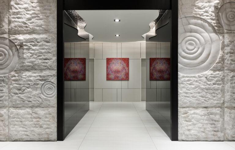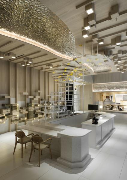由於傳統住宅大樓的大廳機能通常僅有接待台和信件管理室,因此經常處於閒置狀態。而為避免浪費可用空間,在思維轉換革新的驅使下,本案不僅導入了時下流行的咖啡廳於大廳,更是將信件收發區、會議廳和交誼區等機能整合於此。冀望藉此提高住戶使用頻率,達到活化空間的效果。另外,團隊有適度引用石壁、流水、森林等元素,可為其形塑出北歐山麓下的悠閒意境。