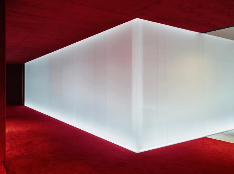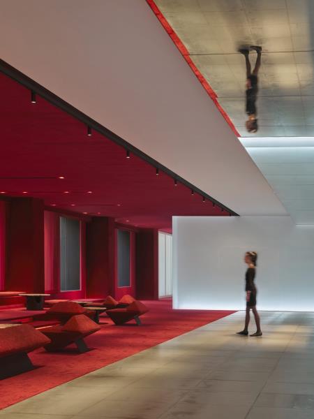 本案規劃有別於傳統的藝廊會館形式,空間不再只作為藝文展演使用,而是還能作為社區民眾聚會、舉辦慈善活動用的場地,大幅提升了空間使用的彈性與多元化。為了給予造訪者不同以往的藝廊會館體驗,本案先是以強烈的紅色調作為空間主軸,使人想深入探索空間,而後再以可透光的白膜玻璃牆和淺灰色鋪面的設計,平衡整體的色彩比重,避免空間產生壓迫感。其中,配置的白膜玻璃牆,擁有絕佳的耐震性與防爆性,可提高場域使用的安全性。同時,玻璃中間的膜還能有效抑制熱能產生,讓空間無需使用冷氣設備也能維持清新涼爽,間接達到節能減碳的效果。