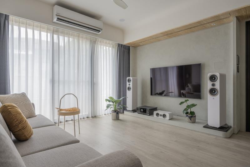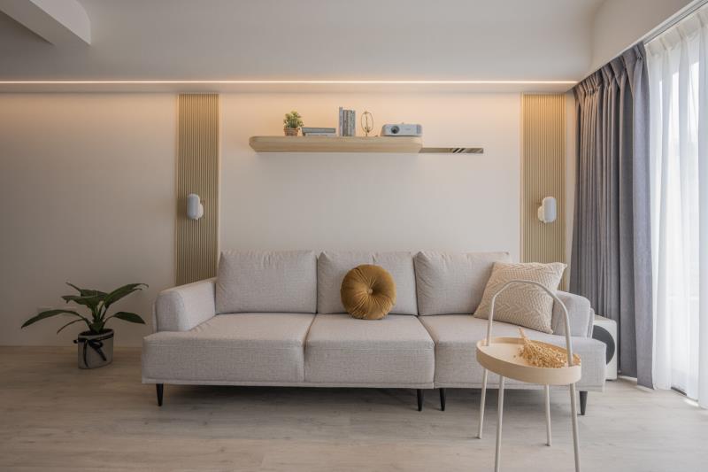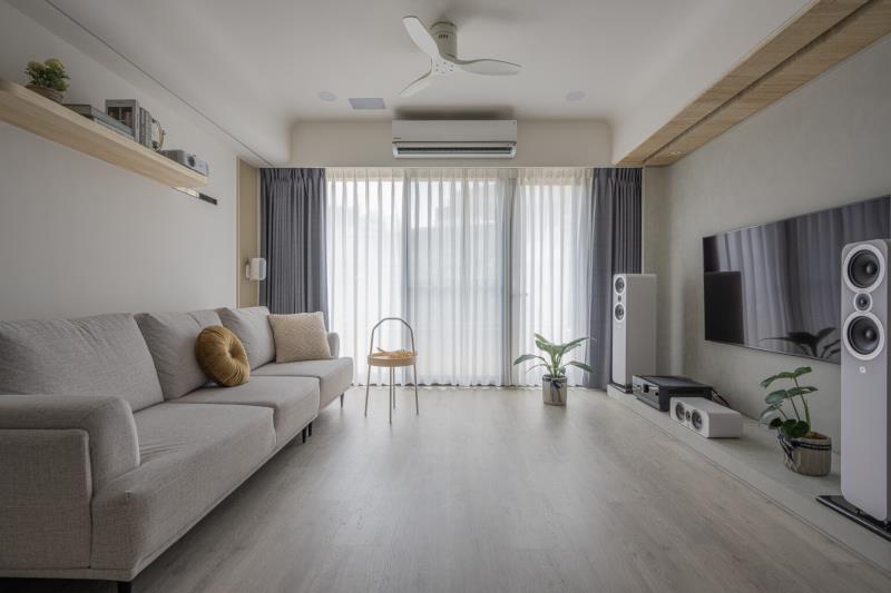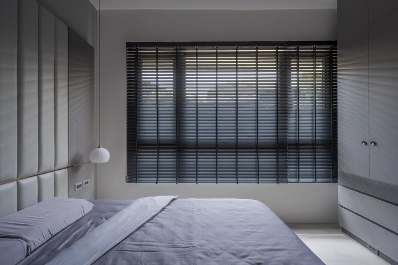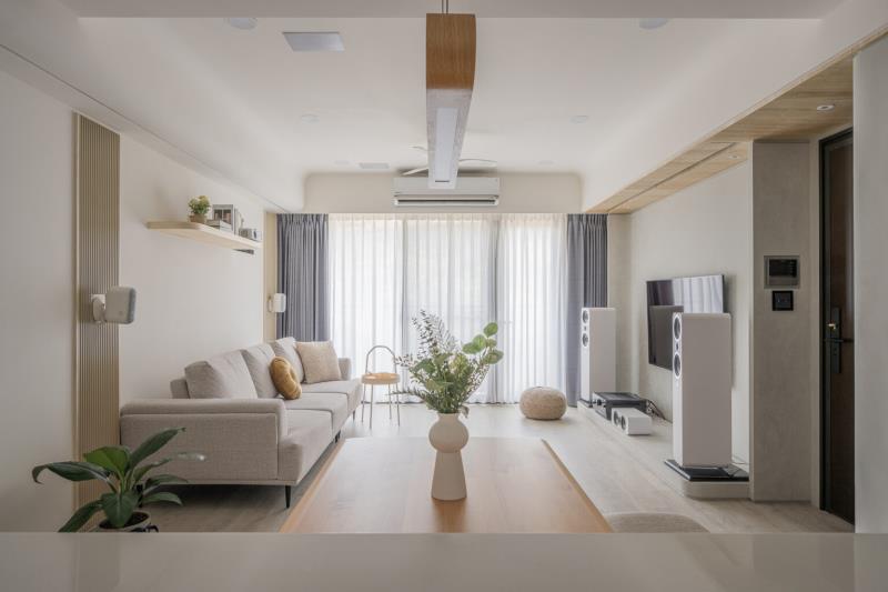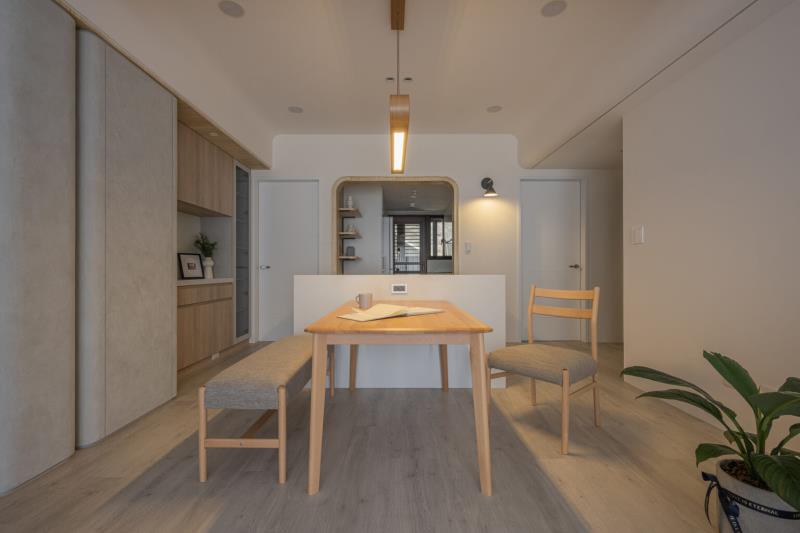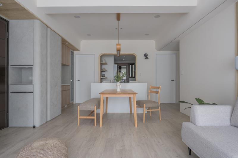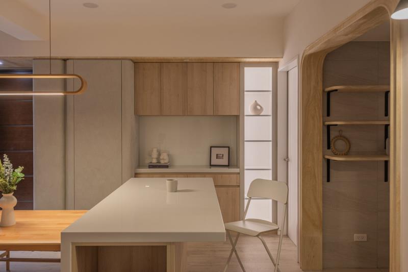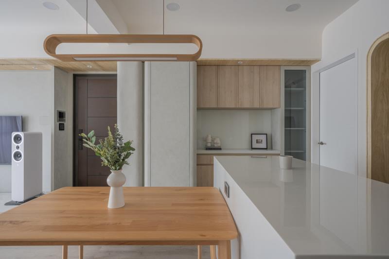 甫入屋內,團隊先以開放式設計整合公領域,再將客廳、餐廳、廚房規劃在同一軸線上,讓自然光得以流淌於全室,避免內部空間過於昏暗之情形。其中,團隊採用了弧形的牆面與天花板設計,不僅能消弭傳統住宅冷硬、銳利的空間感,還能降低居者磕碰受傷的風險。另外,本住宅有導入智能家居系統,包括冷氣、總開關、智能燈具、電動窗簾及音響等設備,讓屋主僅需藉由語音或手機便能輕鬆控制,大幅提升了居住的便利性與靈活性。同時,團隊巧妙運用隱藏式手法,將音響、投影等電子設備融入牆面與樑體之中,讓科技與美學完美結合,兼顧美觀與實用性。置身於餐廳,團隊將餐桌與中島做銜接,不僅能容納更多使用者,還能因應用餐、備餐與辦公等多種使用情境。緩步移動至私領域,有別於公領域的明亮、輕淺調性,該場域則是以內斂沉穩的莫蘭迪色作為基底,以此營造安穩舒適的休憩氛圍。其中,屋內設置的橫式百葉窗在完全閉合的狀態下,可達到完全遮光與不透視的效果,為屋主提供隱私與安全。