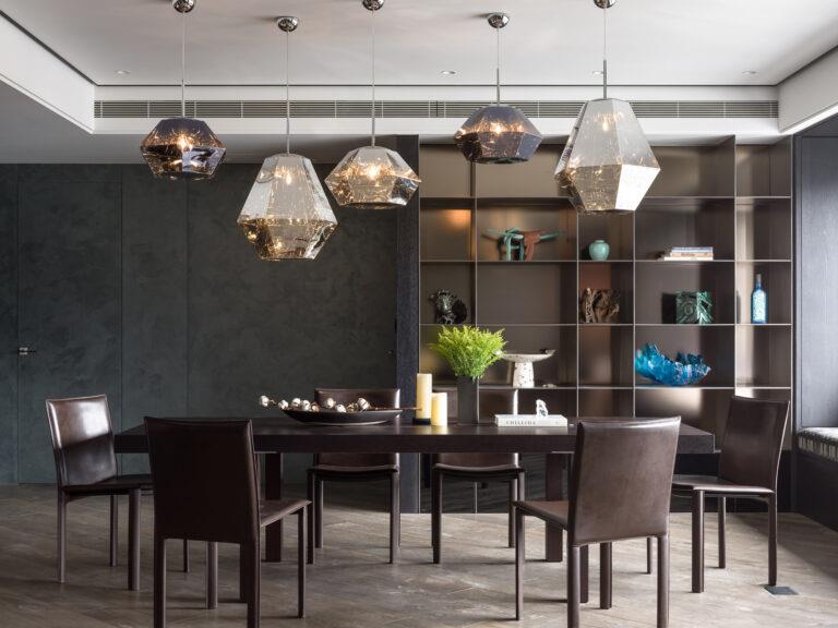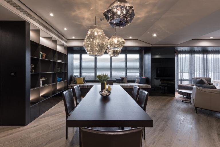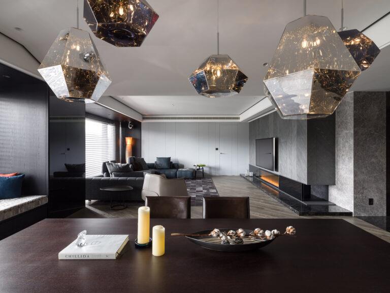 甫入落塵區,採用相異的地面材質與客廳做出區分,而無高低落差的地坪設計,能減少居者磕絆受傷的機率。客廳以灰階色調為主軸,結合溫潤的木質地板,為居者帶來雅緻的公共空間。由於客廳上方有根大樑,因此設計師使用斜邊角的手法,修飾了銳利的直角線條,弱化大樑的空間壓迫感。電視牆下方配置的電子壁爐,不只帶來異國風情,亦具有健康環保、安全衛生、無需燃料等優點。餐廳設有一張長餐桌,讓親朋好友來訪時便於相聚用餐,能增進彼此的互動頻率與情感關係。餐桌旁運用開放式展示櫃,不僅提供屋主置物、擺飾的功能,亦帶來高雅的藝術美感。配上幾何造型吊燈柔美的光線,締造溫馨愜意的用餐氛圍。廚房以磁磚地板鋪陳,除了劃分區域外,還具有易於清潔的功能,讓屋主能夠更輕鬆的清除料理時產生的髒污。