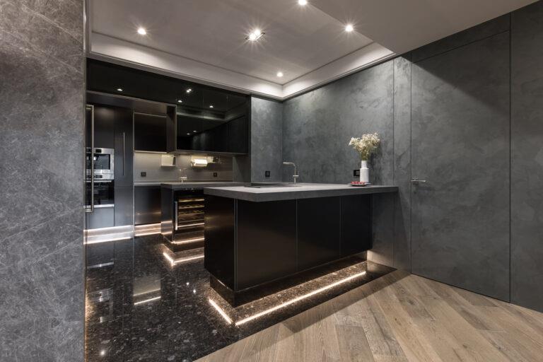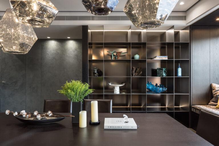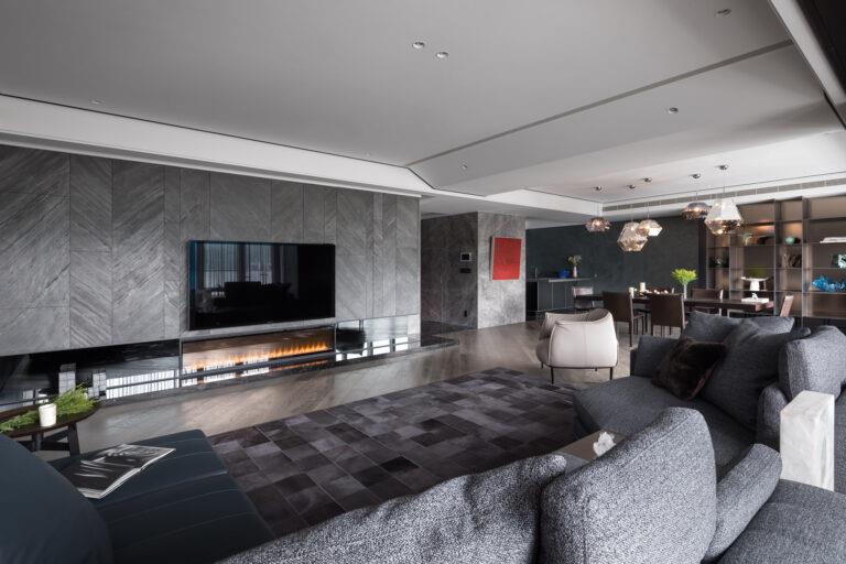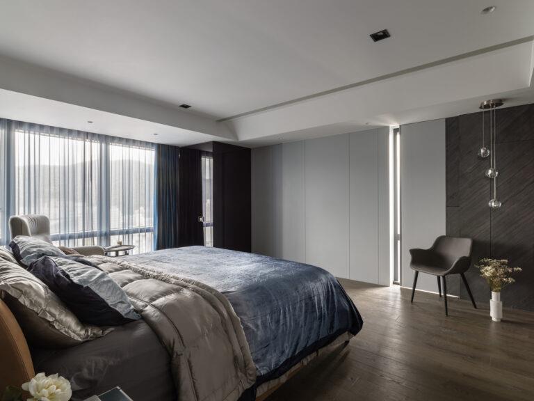 本案榮獲 2024英國IAA倫敦設計大獎 London Design Awards – 金獎。本案為位於市中心的私宅規劃案。因應屋主的喜好,設計師選擇了較暗的灰階色系,搭配靛藍色鋪陳空間,呈現出沈穩、典雅的低調奢華感。並且以開放式手法安排格局,搭配落地窗的設置,營造寬敞、明亮的居住環境。為了迎合屋主的使用需求,設計師為其量身定制多樣化的收納櫃,提供充足且靈活的儲物機能。此外,本案的牆面與門運用相同的材質、色調,讓視覺上達到一致,創造渾然一體的空間效果。
