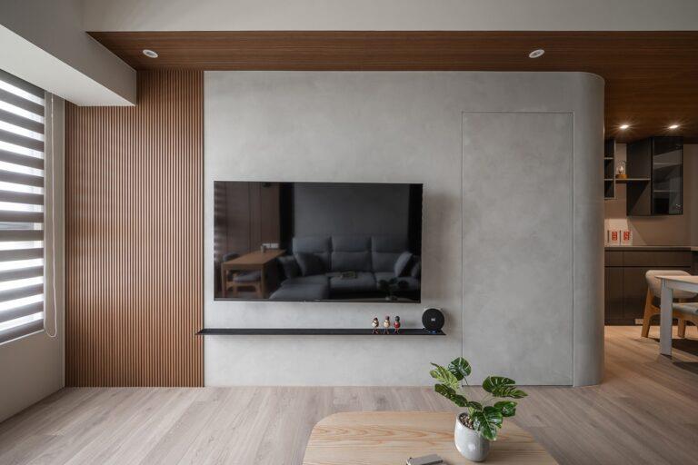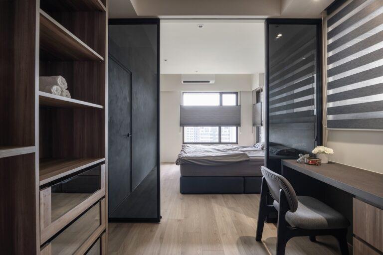 緩步移動至私領域,設計師巧妙以暗門設計將其隱匿於電視牆後。向內走去,設計師特地採用雙門設計以區隔臥室、衛浴室與公領域,藉此避免親朋好友誤闖臥室的疑慮。另外,過道空間亦有善用畸零空間設置收納區,以增加儲物量。通往置臥室,除了基本的床位配置之外,設計師還有規劃一間完整的更衣間,能提供居者收納、梳妝、更衣等多種用途。