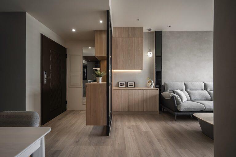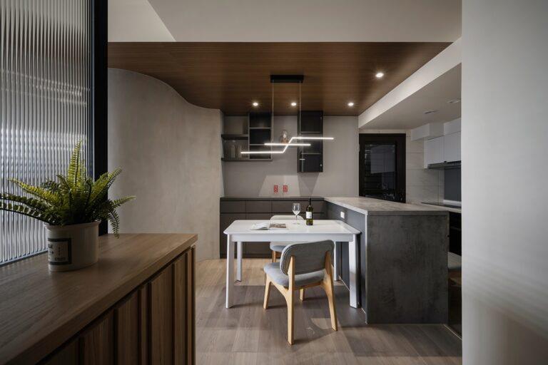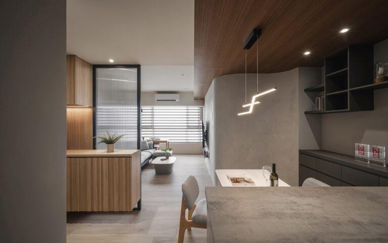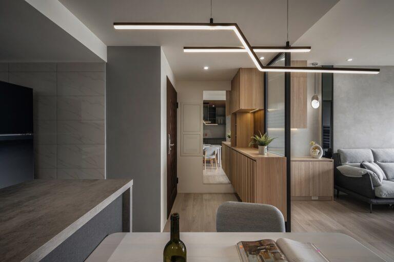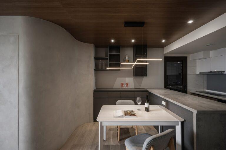 甫入玄關,設計師特地採用長虹玻璃銜接櫃體,藉由其透光的特性避免傳統實體隔間牆產生的空間壓迫感。另外,配置全身鏡於側牆面,不僅能提供居者於此整理儀容,還能達到空間尺度擴展的效果。走至公領域,考量到該住宅僅有單面採光,設計師便以開放式的設計將客廳、書房與餐廚空間做整合,讓自然光能毫無阻礙地流淌於室。置身於餐廚空間,設計師採用弧形的牆體設計,不僅能為動線增添流暢度,還能弱化空間的銳利稜角,讓使用上更加安全。值得一提的是,吧台檯面是選用系統板材,可利用其耐刮、抗污的特性提升傢俱的使用壽命。
