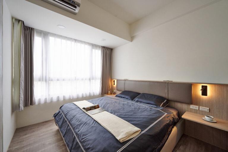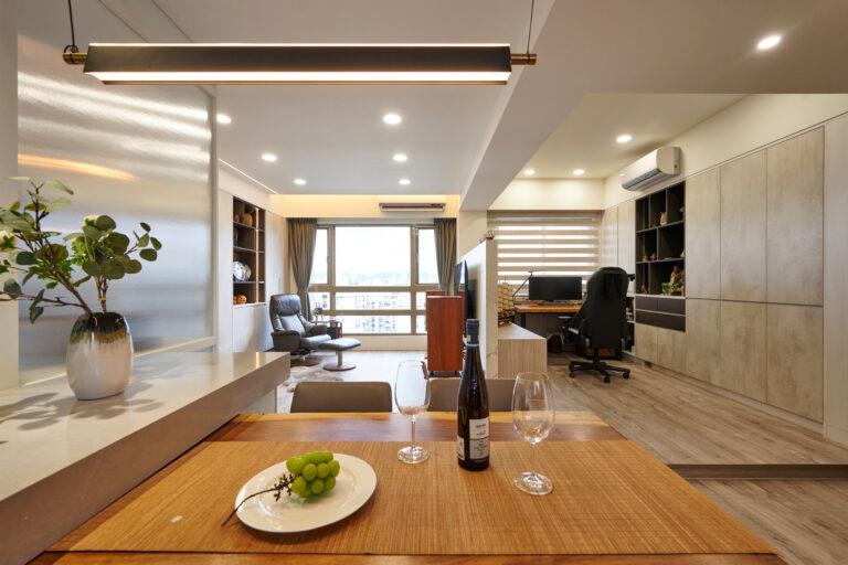 甫入室內,客廳運用半高電視牆設計,除了有助於採光與室內空氣流通,亦避免了高大牆面的壓迫感,塑造開闊的視野,提供居者愜意的活動場域。用餐區配有原木材質的餐桌,呈現精緻、自然的用餐環境。開放式的書房在使用上更加流暢,透過從地面、桌具、櫃體的大量木質調,帶來溫馨自在的靜態空間。臥室延續了公領域的色調與質地,以溫潤的木紋鋪陳空間,讓居者得以享受溫暖的休憩時光。