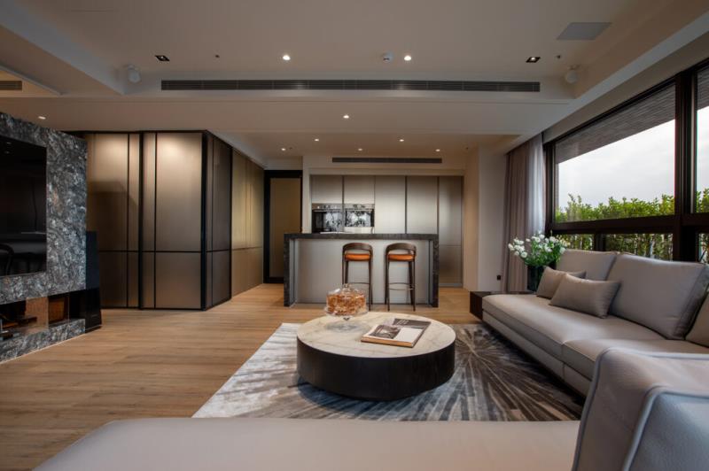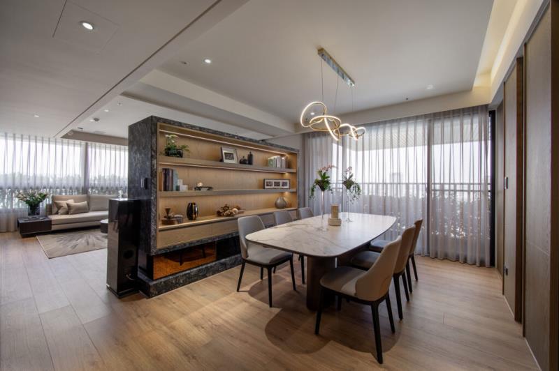 此案整體運用經典的黑、白、灰色系營造優雅大氣的格調,鮮豔度較低的色彩也柔和了視覺上的感受,讓人能夠愜意、放鬆的休憩。客廳內的電視牆採用了半高牆設計,不同於一般住宅整面式的隔牆,不僅能提升採光和通風效果,還能讓原本寬闊的空間多了一種串聯的意象,拉近居者之間的生活距離,產生安心、融洽的感受。與客廳間以電視牆為界的餐廳,由環環相扣造型的吊燈提供柔和光源,搭配輕奢風的桌椅,展現出精緻的藝術氣息。電視牆的背面設計成展示收納櫃,充分的利用空間提供儲物機能。客廳與開放式廚房之間只相隔一座中島吧台,使整體視覺上更顯開闊,也讓居住者能在烹飪時與客廳的親朋好友互動,達到維繫感情的功能。