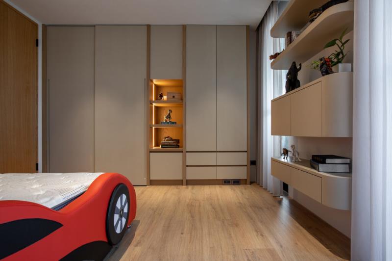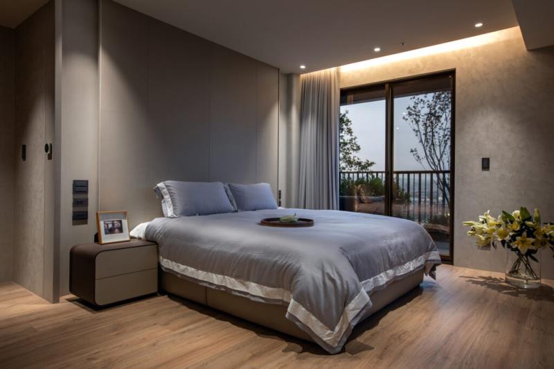 主臥室延續公領域的灰階色調,在昏黃的間接照明之下,使空間充滿生活的詩意和情感。此外設計師還特意帶入綠化設計,在陽台上配置了景觀植栽,使綠意和光影能夠從落地窗外流入室內,打造出與自然環境和諧相襯的居住體驗。小孩房則以原木色與淺色調為主軸,使其具有溫暖安逸的溫馨感受。收納架的邊緣使用弧形設計而非一般的直角造型,讓孩子能夠安心玩耍,不必害怕磕絆受傷,塑造出一個舒適、健康的成長環境。