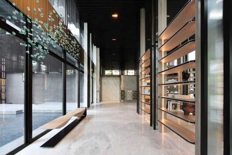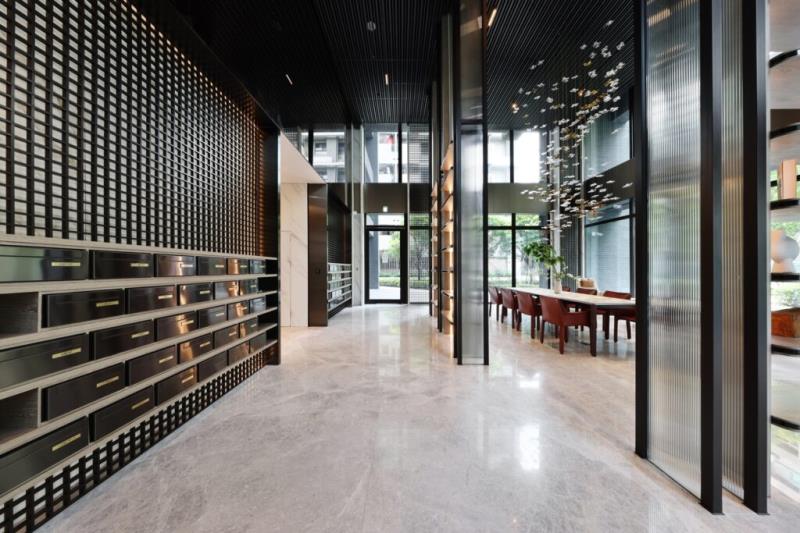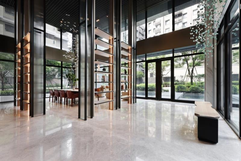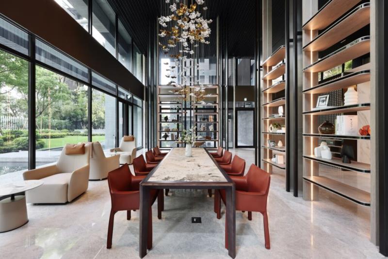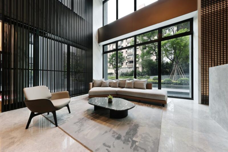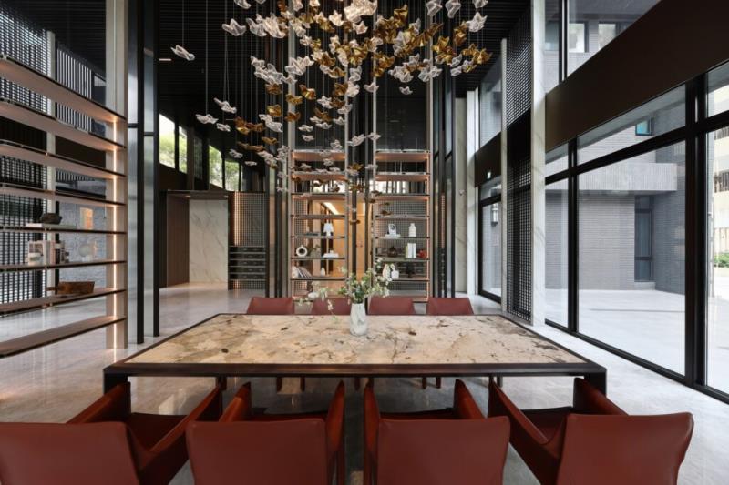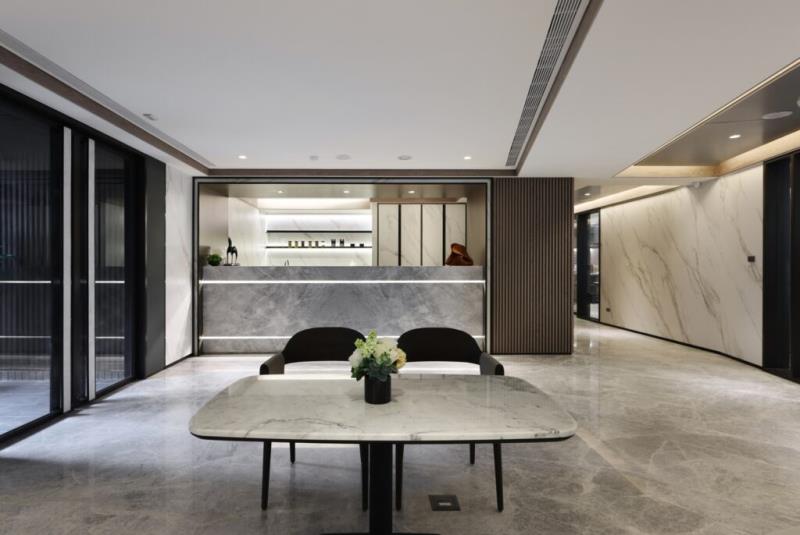 整體設計著重宏觀的對稱結構和微觀的細節層次。置身於主體空間,團隊先是採開放式佈局整合接待區、休憩區和會議區,而後再利用隔屏層架設計明確劃分各功能區,使其在容納多元機能設施的同時,又能維持視覺的連續性。此外,空間是由透光的落地窗所圍塑而成,能有效提高全室的採光度,並增強室內、外的連結。其中,窗框便具備著框景作用,能將戶外的綠意、光影、水景轉化成一幅亦動亦境的藝術畫作,使環境、空間與人產生對話。在室內建構上,團隊特別採用質感細膩的大理石材做基底,並搭配不規則造型的金屬燈具和藝術掛件,以此彰顯獨樹一幟的現代美學。同時,將傢俱與嵌入式燈光系統相結合,可實現科技與藝術的和諧相容,並提升空間辨識度和使用者體驗。其中,傢俱是以高舒適度、耐用為主,既能為住戶提供絕佳的使用感受,又能降低日後的維護成本。