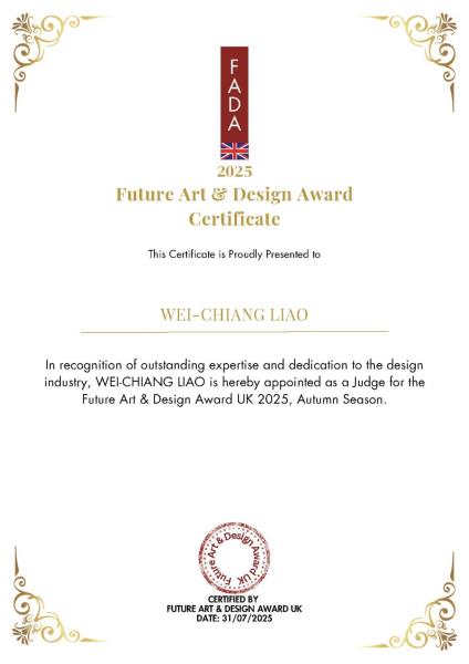 為了表彰對評審專業貢獻的高度肯定,英國 FADA 不僅授予國際評審聘書,更提供專屬專業酬金,彰顯其尊崇價值與全球威信。唐林設計廖韋強總監此次獲邀加入評審團,印證其在國際設計領域的深厚影響力,同時昭示台灣設計力量正於全球創意標準與國際設計論壇中,佔據愈發舉足輕重的關鍵地位。