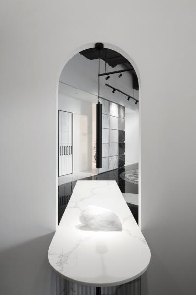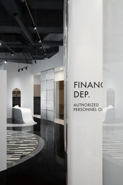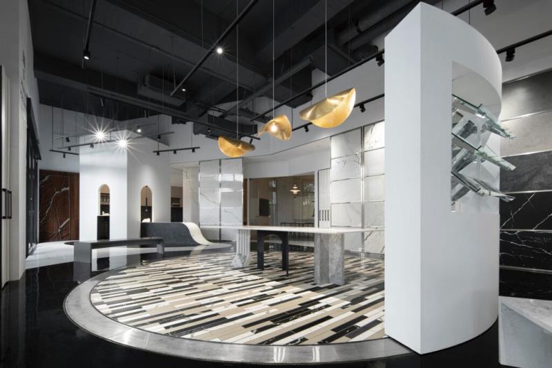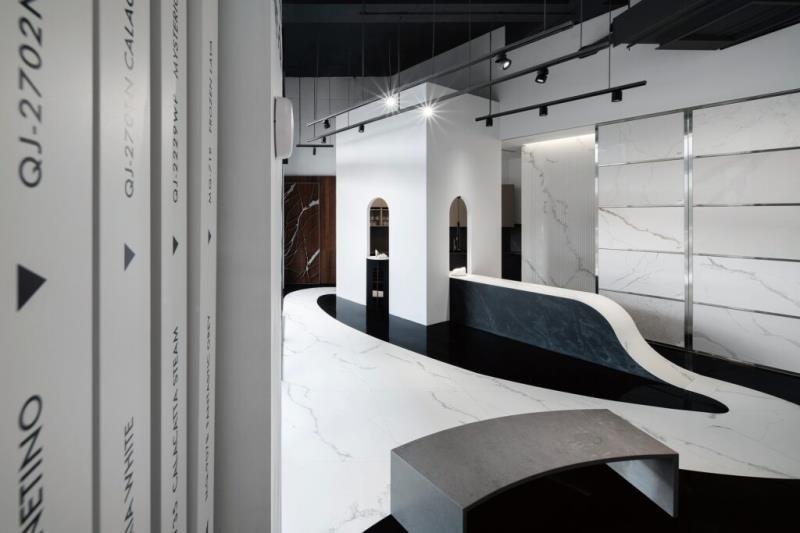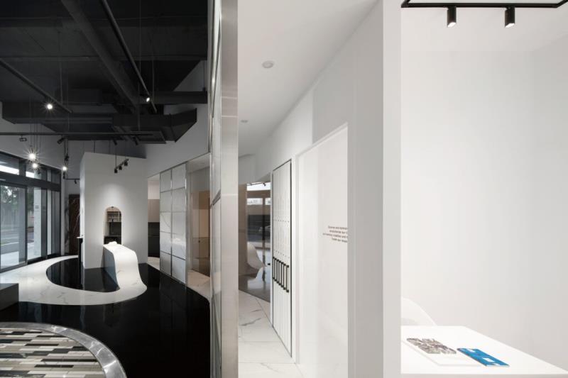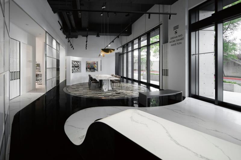 步入大門,地面採用黑色的環氧樹脂EPOXY材質鋪陳,宛若園林中的「湖水」,為展間奠定大膽、沉靜的基調。而如緞帶般蜿蜒的白色石英石地面,巧妙的引導參觀動線,將石材最新穎的應用性展現在沿途的各個細節中,給予訪客豐富且引人入勝的空間體驗。位於黑色地坪中央的會議區,猶如漂浮於水面的白色島嶼涼亭。會議區的後方配置了屏風般的石材展示門片,其滑動的功能可以根據需求調整,為空間帶來動態的景致變化,並展示不同的石材主題,實現靈活多變的展示效果。而當訪客繞著會議區遊走,每一步皆呈現出不同的景象,體現了「移步換景」的概念。
