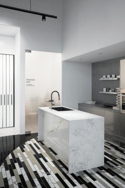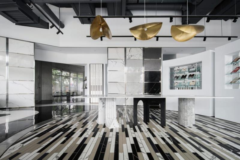 藉由通透的視覺、流暢的動線與相互連接的功能性,完美詮釋以上設計原則。地板由石材切割後的餘料拼接而成,創造繽紛的色彩搭配,刺激訪客思考各種新穎的石材使用可能性,同時也提供一個友善環境又富有創意的永續材料解決方案。