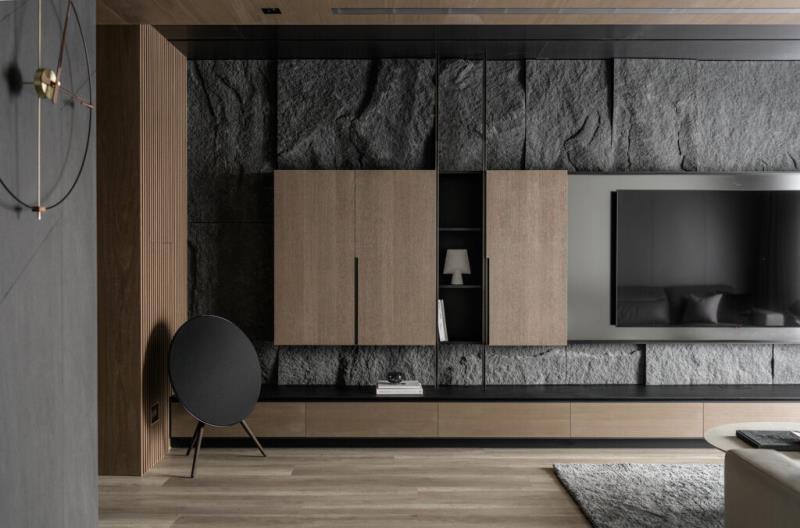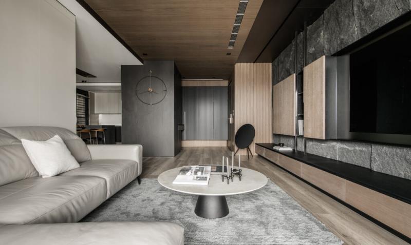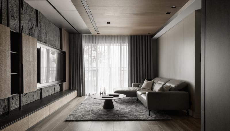 由於團隊相信材料的自然肌理能誘發人們潛意識的情感反應、強化靈魂的存在感,因此本案便決定採用溫潤的手染木皮、富含有機紋理的天然石皮、柔軟的織布與柔和的米色冷烤漆底定空間。不僅能為屋主提供沈穩內斂的視覺、柔和舒適的觸感,還能為悄然劃分公、私領域,創造出張弛有度的生活場景。