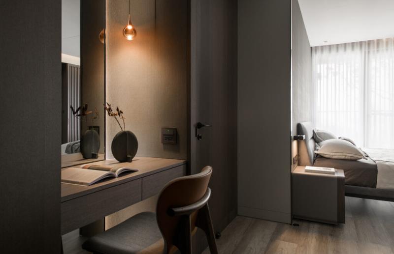 為構建出人性化的居住空間,本案是以「形隨機能」的概念進行擘劃。包括在餐廳設置用餐、辦公兩用的長桌,提高空間使用效率;於主臥規劃兩區儲物空間,因應屋主不同的收納需求;以臨窗床榻整合書桌的形式,增加小孩房的收納與閱讀空間。透過契合基地環境、空間佈局與屋主需求的機能設計,創造出兼具美觀與實用性的住所。