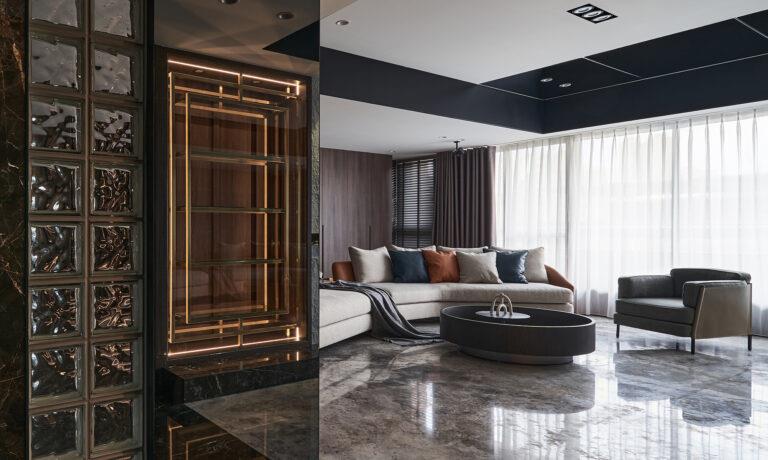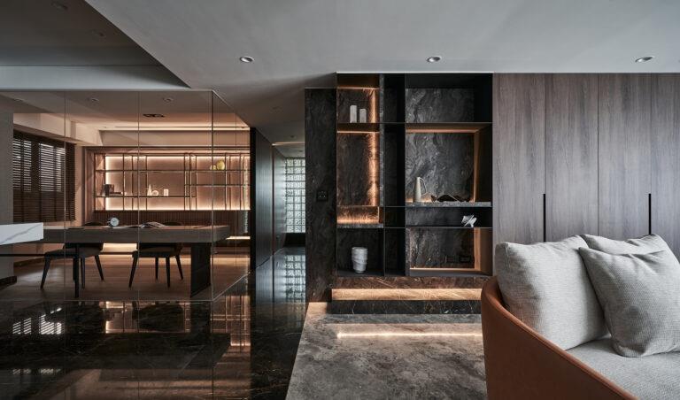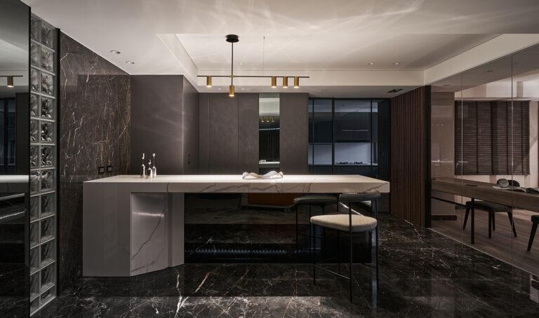 甫入玄關,團隊採用大理石薄板、玻璃磚與鏡面打造端景牆,以營造精緻高雅的入室氛圍。其中,鏡面的配置亦能提供屋主出門前整理儀容。向內走去,公領域採開放式格局將客廳與餐廳做整合,再搭配廚房和書房的玻璃隔間設計,可強化主體空間的開闊度與連貫性。客廳電視牆是由石皮壁板和鍍鈦鐵件組構而成。其中,展示櫃延續鍍鈦元素的應用,能讓視覺畫面更顯一致。望向用餐區,團隊以鏡面材料綴飾中島桌腳和局部牆面,可有效減輕石材帶來的厚重感。為避免烹調時的油煙逸散,團隊特地採灰玻拉門作為廚房隔間,能同時維持視線與光線的穿透。