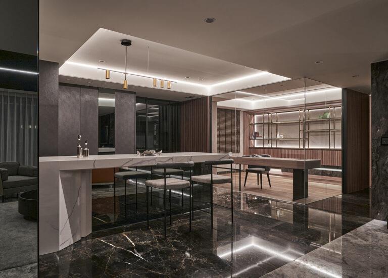 本案榮獲 2025 米蘭設計大獎 MILAN Design Awards- 銀獎。本案是以奢華美學為核心的老屋翻新規劃案。透過大量的鏡面、鍍鈦金屬、玻璃元素及各式紋理斑斕的石材應用,搭配自然光與燈光的映射,不僅能為居所形塑出高格調的生活情境,還能增添通透度、改善原先場域昏暗之情形。其中,木質材料的穿插鋪陳,可有助於平衡空間比重。另外,主體空間是以開放式格局進行擘劃,能提供寬敞的活動範圍與流暢的行走動線,為屋主構建出舒適、美觀、便利的居住環境。